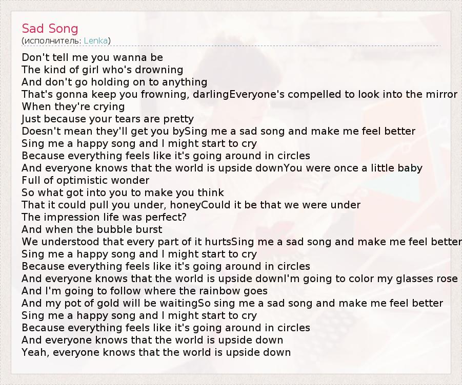 Don't tell me you wanna be The kind of girl who's drowning And don't go holding on to anything That's gonna keep you frowning, darlingEveryone's compelled to look into the mirror When they're crying Just because your tears are pretty Doesn't mean they'll get you bySing me a sad song and make me feel better Sing me a happy song and I might start to cry Because everything feels like it's going around in circles And everyone knows that the world is upside downYou were once a little baby Full of optimistic wonder So what got into you to make you think That it could pull you under, honeyCould it be that we were under The impression life was perfect? And when the bubble burst We understood that every part of it hurtsSing me a sad song and make me feel better Sing me a happy song and I might start to cry Because everything feels like it's going around in circles And everyone knows that the world is upside downI'm going to color my glasses rose And I'm going to follow where the rainbow goes And my pot of gold will be waitingSo sing me a sad song and make me feel better Sing me a happy song and I might start to cry Because everything feels like it's going around in circles And everyone knows that the world is upside down Yeah, everyone knows that the world is upside down