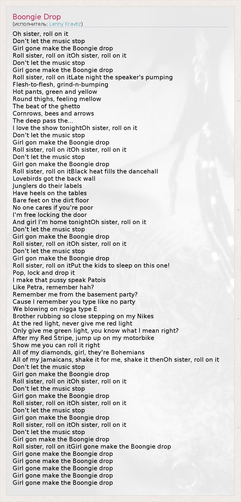 Roll sister, roll on itGirl gone make the Boongie drop