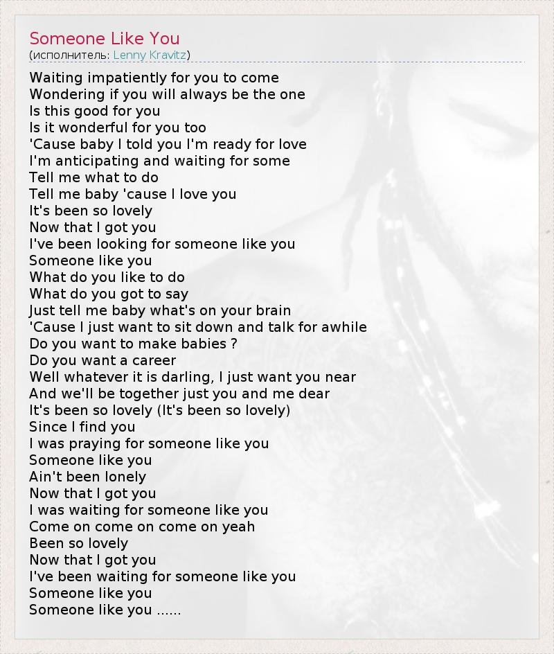 Waiting impatiently for you to come Wondering if you will always be the one Is this good for you Is it wonderful for you too 'Cause baby I told you I'm ready for love I'm anticipating and waiting for some Tell me what to do Tell me baby 'cause I love you It's been so lovely Now that I got you I've been looking for someone like you Someone like you What do you like to do What do you got to say Just tell me baby what's on your brain 'Cause I just want to sit down and talk for awhile Do you want to make babies ? Do you want a career Well whatever it is darling, I just want you near And we'll be together just you and me dear It's been so lovely (It's been so lovely) Since I find you I was praying for someone like you Someone like you Ain't been lonely Now that I got you I was waiting for someone like you Come on come on come on yeah Been so lovely Now that I got you I've been waiting for someone like you Someone like you Someone like you ......