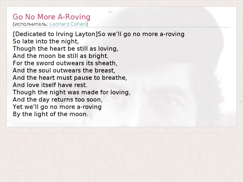 [Dedicated to Irving Layton]So we'll go no more a-roving So late into the night, Though the heart be still as loving, And the moon be still as bright. For the sword outwears its sheath, And the soul outwears the breast, And the heart must pause to breathe, And love itself have rest. Though the night was made for loving, And the day returns too soon, Yet we'll go no more a-roving By the light of the moon.