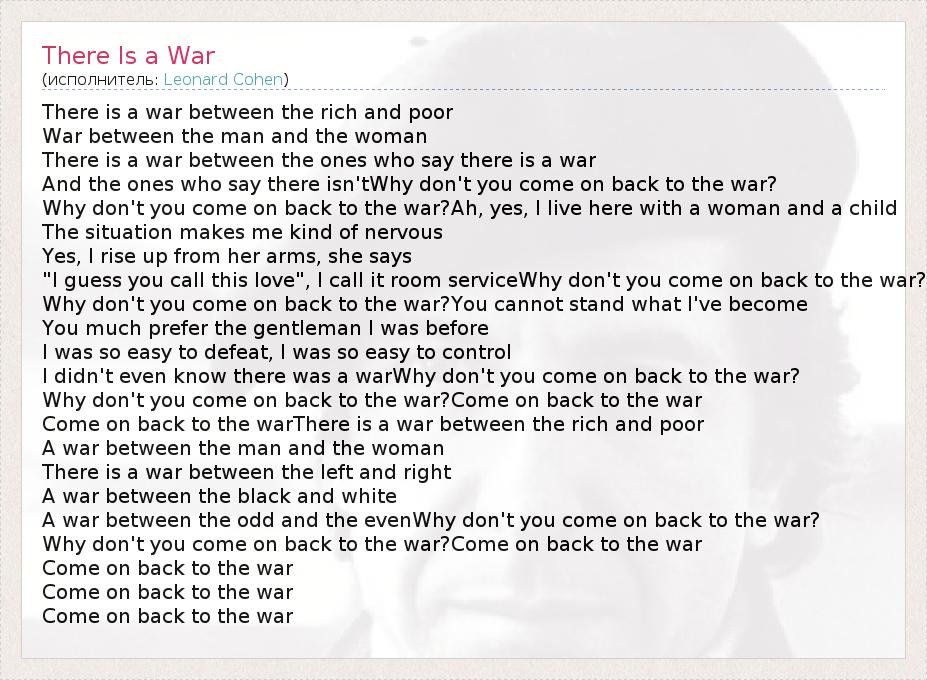 Why don't you come on back to the war?Ah, yes, I live here with a woman and a child