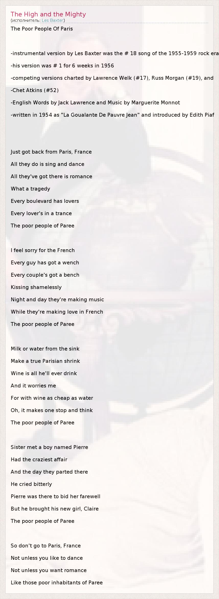 -written in 1954 as "La Goualante De Pauvre Jean" and introduced by Edith Piaf