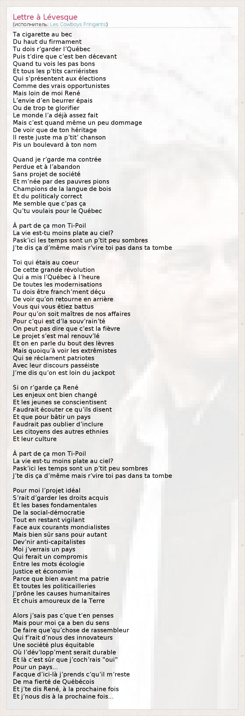 А как ты думаешь, о чем песня "Lettre à Lévesque" ?