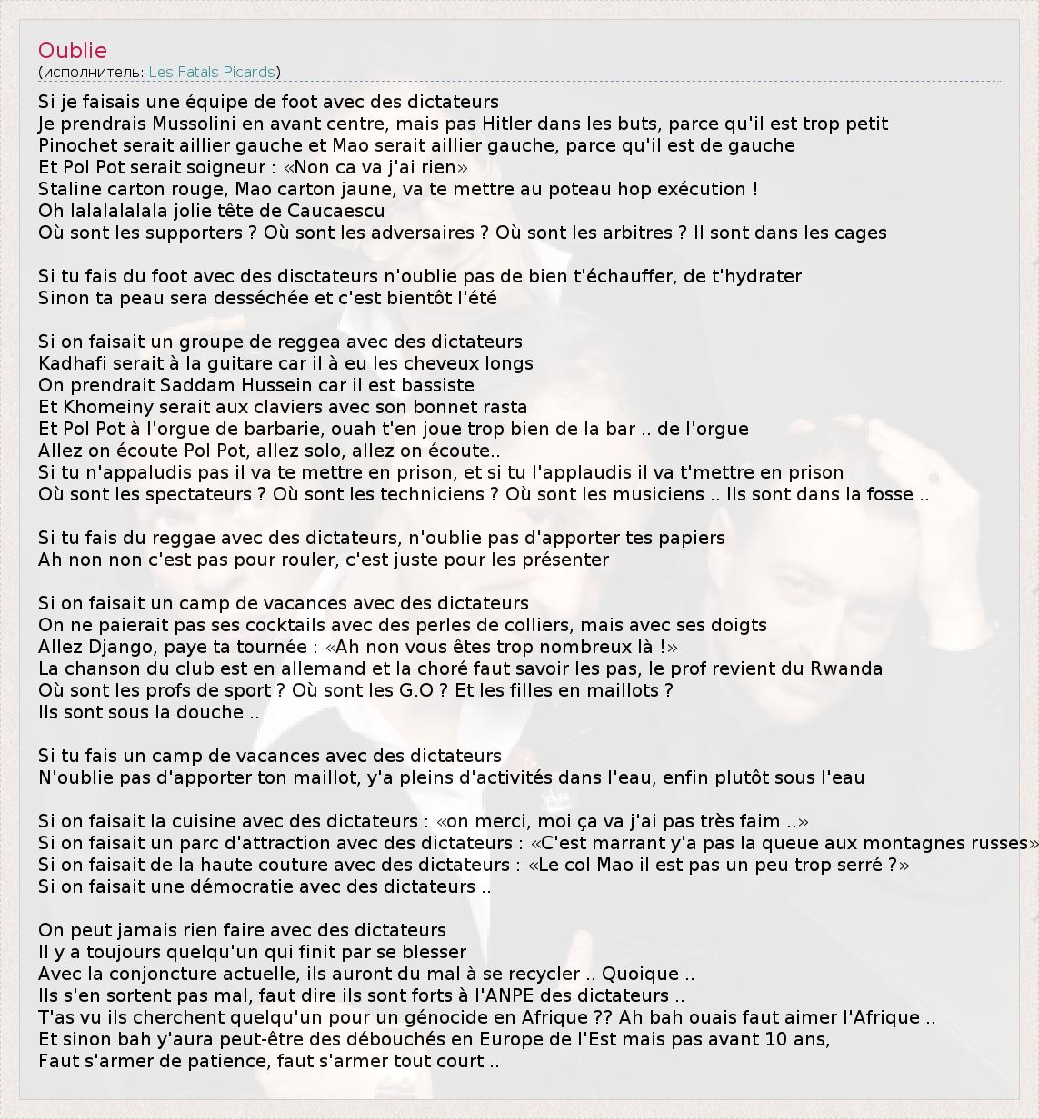 Si je faisais une équipe de foot avec des dictateurs Je prendrais Mussolini en avant centre, mais pas Hitler dans les buts, parce qu'il est trop petit Pinochet serait aillier gauche et Mao serait aillier gauche, parce qu'il est de gauche Et Pol Pot serait soigneur : «Non ca va j'ai rien» Staline carton rouge, Mao carton jaune, va te mettre au poteau hop exécution ! Oh lalalalalala jolie tête de Caucaescu Où sont les supporters ? Où sont les adversaires ? Où sont les arbitres ? Il sont dans les cages Si tu fais du foot avec des disctateurs n'oublie pas de bien t'échauffer, de t'hydrater Sinon ta peau sera desséchée et c'est bientôt l'été Si on faisait un groupe de reggea avec des dictateurs Kadhafi serait à la guitare car il à eu les cheveux longs On prendrait Saddam Hussein car il est bassiste Et Khomeiny serait aux claviers avec son bonnet rasta Et Pol Pot à l'orgue de barbarie, ouah t'en joue trop bien de la bar .. de l'orgue Allez on écoute Pol Pot, allez solo, allez on écoute.. Si tu n'appaludis pas il va te mettre en prison, et si tu l'applaudis il va t'mettre en prison Où sont les spectateurs ? Où sont les techniciens ? Où sont les musiciens .. Ils sont dans la fosse .. Si tu fais du reggae avec des dictateurs, n'oublie pas d'apporter tes papiers Ah non non c'est pas pour rouler, c'est juste pour les présenter Si on faisait un camp de vacances avec des dictateurs On ne paierait pas ses cocktails avec des perles de colliers, mais avec ses doigts Allez Django, paye ta tournée : «Ah non vous êtes trop nombreux là !» La chanson du club est en allemand et la choré faut savoir les pas, le prof revient du Rwanda Où sont les profs de sport ? Où sont les G.O ? Et les filles en maillots ? Ils sont sous la douche .. Si tu fais un camp de vacances avec des dictateurs N'oublie pas d'apporter ton maillot, y'a pleins d'activités dans l'eau, enfin plutôt sous l'eau Si on faisait la cuisine avec des dictateurs : «on merci, moi ça va j'ai pas très faim ..» Si on faisait un parc d'attraction avec des dictateurs : «C'est marrant y'a pas la queue aux montagnes russes» Si on faisait de la haute couture avec des dictateurs : «Le col Mao il est pas un peu trop serré ?» Si on faisait une démocratie avec des dictateurs .. On peut jamais rien faire avec des dictateurs Il y a toujours quelqu'un qui finit par se blesser Avec la conjoncture actuelle, ils auront du mal à se recycler .. Quoique .. Ils s'en sortent pas mal, faut dire ils sont forts à l'ANPE des dictateurs .. T'as vu ils cherchent quelqu'un pour un génocide en Afrique ?? Ah bah ouais faut aimer l'Afrique .. Et sinon bah y'aura peut-être des débouchés en Europe de l'Est mais pas avant 10 ans, Faut s'armer de patience, faut s'armer tout court ..
