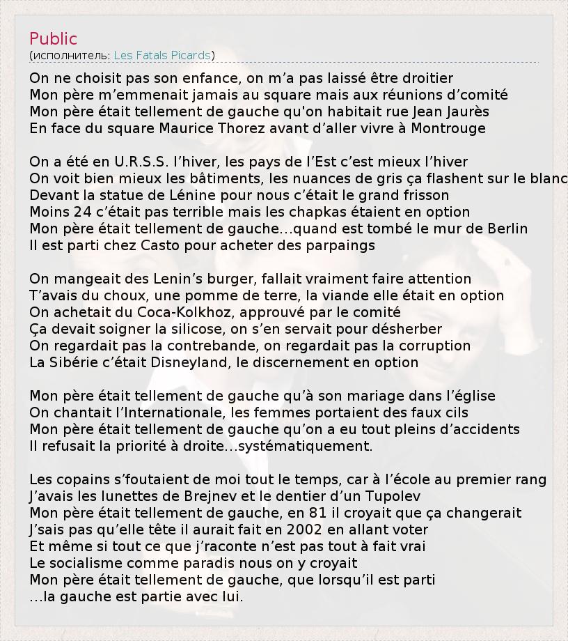 On ne choisit pas son enfance, on m’a pas laissé être droitier Mon père m’emmenait jamais au square mais aux réunions d’comité Mon père était tellement de gauche qu'on habitait rue Jean Jaurès En face du square Maurice Thorez avant d’aller vivre à Montrouge On a été en U.R.S.S. l’hiver, les pays de l’Est c’est mieux l’hiver On voit bien mieux les bâtiments, les nuances de gris ça flashent sur le blanc Devant la statue de Lénine pour nous c’était le grand frisson Moins 24 c’était pas terrible mais les chapkas étaient en option Mon père était tellement de gauche…quand est tombé le mur de Berlin Il est parti chez Casto pour acheter des parpaings On mangeait des Lenin’s burger, fallait vraiment faire attention T’avais du choux, une pomme de terre, la viande elle était en option On achetait du Coca-Kolkhoz, approuvé par le comité Ça devait soigner la silicose, on s’en servait pour désherber On regardait pas la contrebande, on regardait pas la corruption La Sibérie c’était Disneyland, le discernement en option Mon père était tellement de gauche qu’à son mariage dans l’église On chantait l’Internationale, les femmes portaient des faux cils Mon père était tellement de gauche qu’on a eu tout pleins d’accidents Il refusait la priorité à droite…systématiquement. Les copains s’foutaient de moi tout le temps, car à l’école au premier rang J’avais les lunettes de Brejnev et le dentier d’un Tupolev Mon père était tellement de gauche, en 81 il croyait que ça changerait J’sais pas qu’elle tête il aurait fait en 2002 en allant voter Et même si tout ce que j’raconte n’est pas tout à fait vrai Le socialisme comme paradis nous on y croyait Mon père était tellement de gauche, que lorsqu’il est parti …la gauche est partie avec lui.