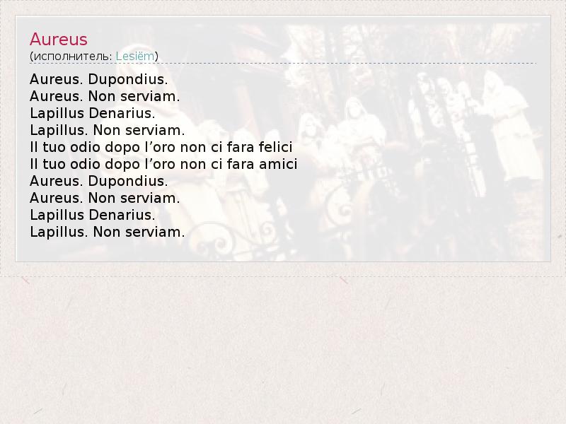 Aureus. Dupondius. Aureus. Non serviam. Lapillus Denarius. Lapillus. Non serviam. Il tuo odio dopo l’oro non ci farа felici Il tuo odio dopo l’oro non ci farа amici Aureus. Dupondius. Aureus. Non serviam. Lapillus Denarius. Lapillus. Non serviam.