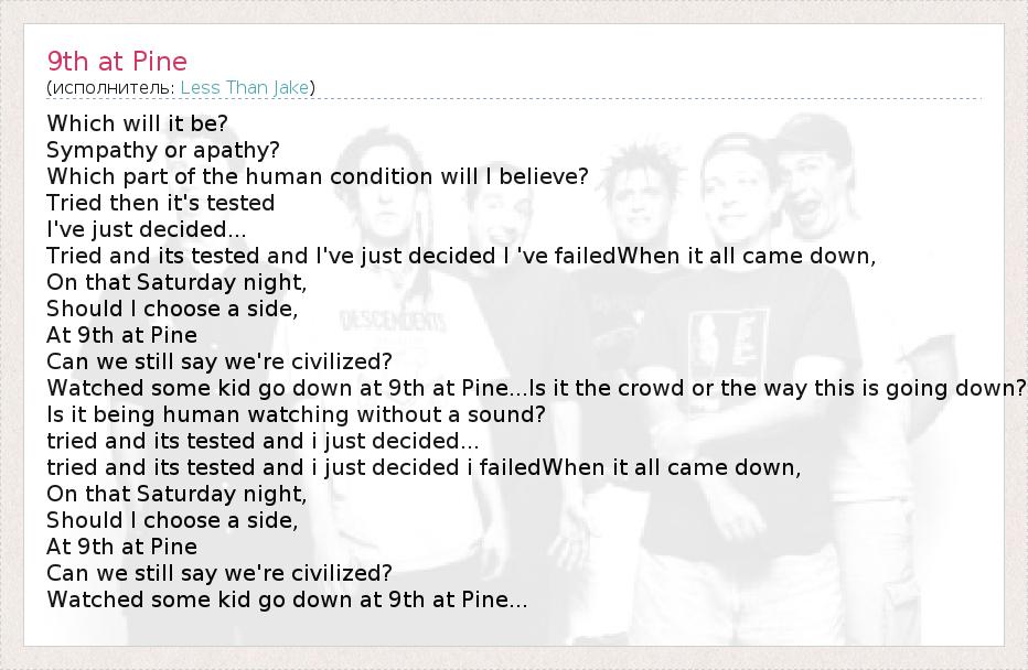 Which will it be? Sympathy or apathy? Which part of the human condition will I believe? Tried then it's tested I've just decided... Tried and its tested and I've just decided I 've failedWhen it all came down, On that Saturday night, Should I choose a side, At 9th at Pine Can we still say we're civilized? Watched some kid go down at 9th at Pine...Is it the crowd or the way this is going down? Is it being human watching without a sound? tried and its tested and i just decided... tried and its tested and i just decided i failedWhen it all came down, On that Saturday night, Should I choose a side, At 9th at Pine Can we still say we're civilized? Watched some kid go down at 9th at Pine...