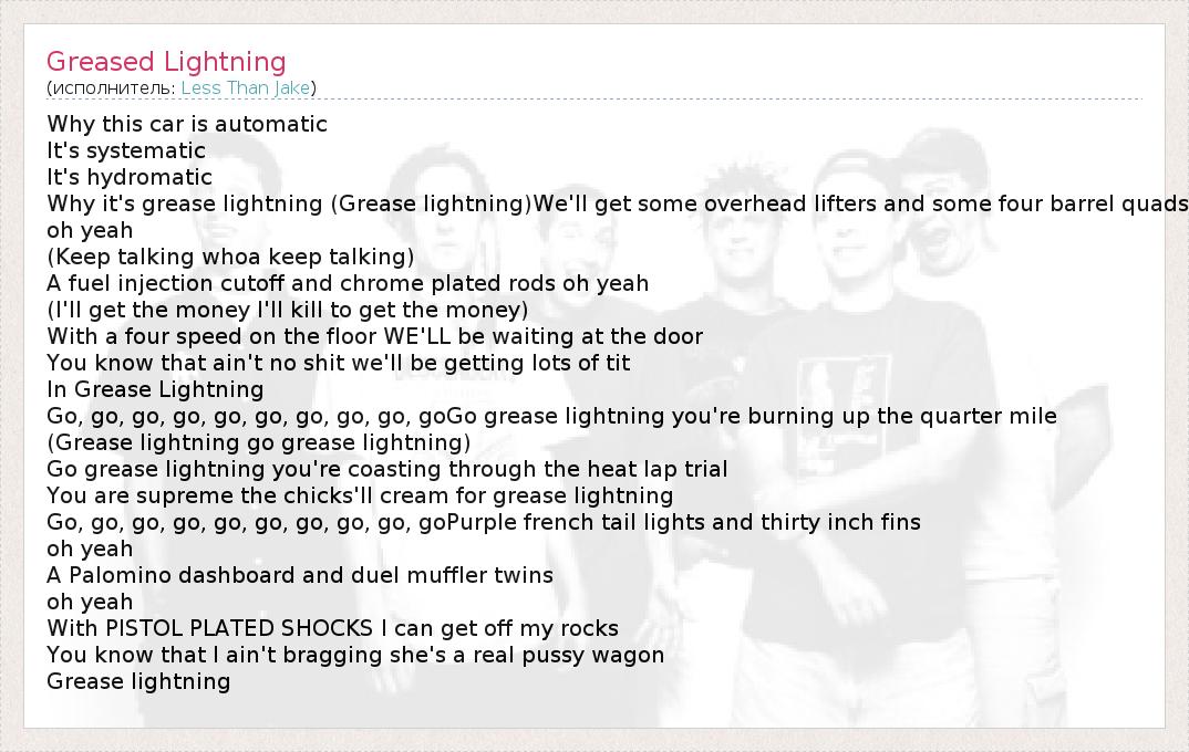 Why this car is automatic It's systematic It's hydromatic Why it's grease lightning (Grease lightning)We'll get some overhead lifters and some four barrel quads oh yeah (Keep talking whoa keep talking) A fuel injection cutoff and chrome plated rods oh yeah (I'll get the money I'll kill to get the money) With a four speed on the floor WE'LL be waiting at the door You know that ain't no shit we'll be getting lots of tit In Grease Lightning Go, go, go, go, go, go, go, go, go, goGo grease lightning you're burning up the quarter mile (Grease lightning go grease lightning) Go grease lightning you're coasting through the heat lap trial You are supreme the chicks'll cream for grease lightning Go, go, go, go, go, go, go, go, go, goPurple french tail lights and thirty inch fins oh yeah A Palomino dashboard and duel muffler twins oh yeah With PISTOL PLATED SHOCKS I can get off my rocks You know that I ain't bragging she's a real pussy wagon Grease lightning