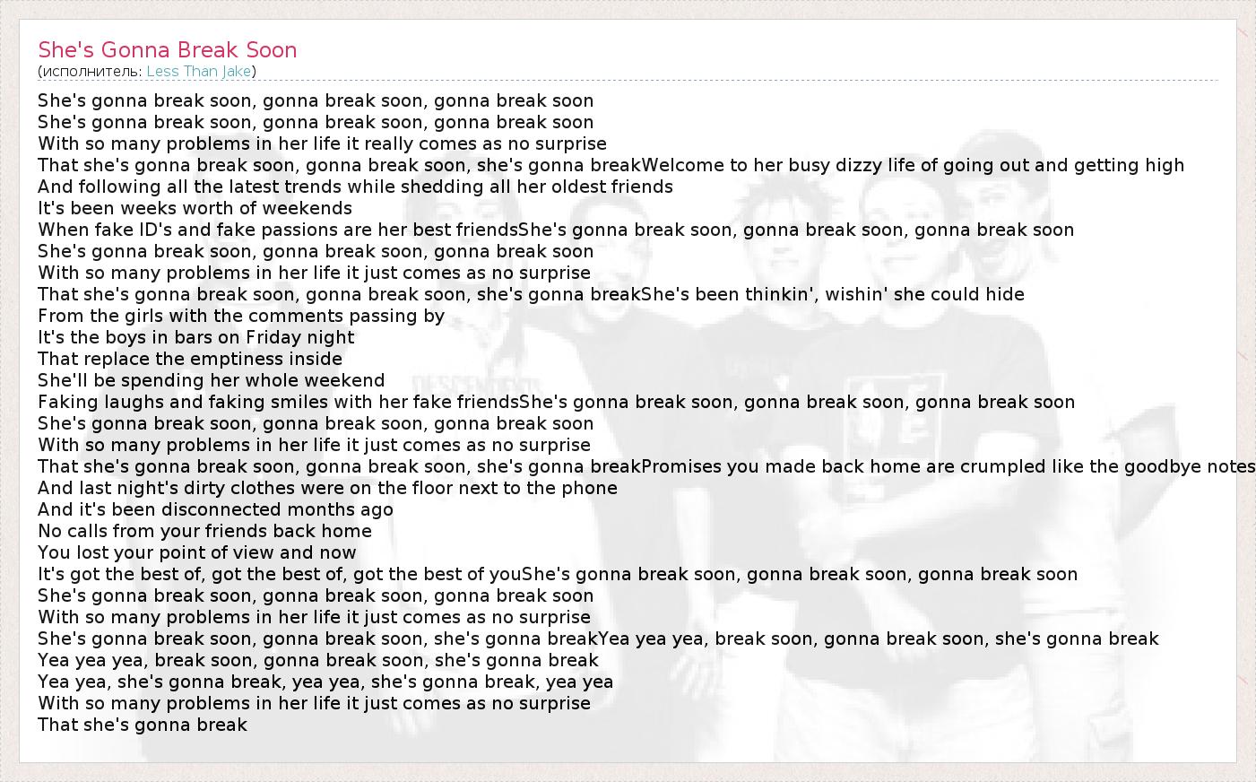 She's gonna break soon, gonna break soon, gonna break soon She's gonna break soon, gonna break soon, gonna break soon With so many problems in her life it really comes as no surprise That she's gonna break soon, gonna break soon, she's gonna breakWelcome to her busy dizzy life of going out and getting high And following all the latest trends while shedding all her oldest friends It's been weeks worth of weekends When fake ID's and fake passions are her best friendsShe's gonna break soon, gonna break soon, gonna break soon She's gonna break soon, gonna break soon, gonna break soon With so many problems in her life it just comes as no surprise That she's gonna break soon, gonna break soon, she's gonna breakShe's been thinkin', wishin' she could hide From the girls with the comments passing by It's the boys in bars on Friday night That replace the emptiness inside She'll be spending her whole weekend Faking laughs and faking smiles with her fake friendsShe's gonna break soon, gonna break soon, gonna break soon She's gonna break soon, gonna break soon, gonna break soon With so many problems in her life it just comes as no surprise That she's gonna break soon, gonna break soon, she's gonna breakPromises you made back home are crumpled like the goodbye notes And last night's dirty clothes were on the floor next to the phone And it's been disconnected months ago No calls from your friends back home You lost your point of view and now It's got the best of, got the best of, got the best of youShe's gonna break soon, gonna break soon, gonna break soon She's gonna break soon, gonna break soon, gonna break soon With so many problems in her life it just comes as no surprise She's gonna break soon, gonna break soon, she's gonna breakYea yea yea, break soon, gonna break soon, she's gonna break Yea yea yea, break soon, gonna break soon, she's gonna break Yea yea, she's gonna break, yea yea, she's gonna break, yea yea With so many problems in her life it just comes as no surprise That she's gonna break