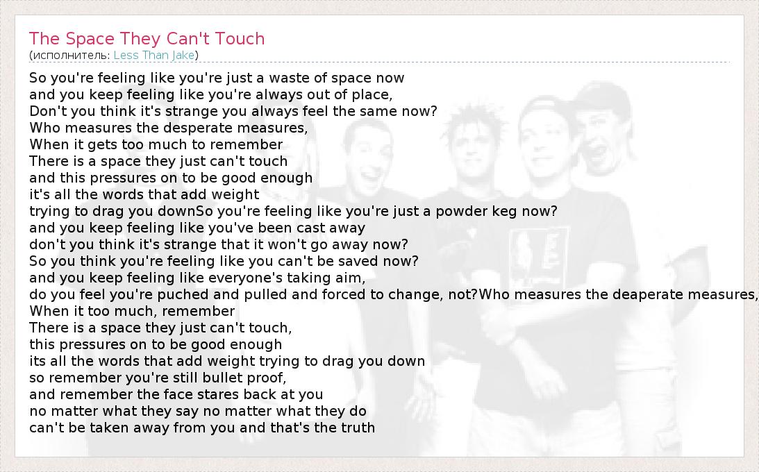 So you're feeling like you're just a waste of space now and you keep feeling like you're always out of place, Don't you think it's strange you always feel the same now? Who measures the desperate measures, When it gets too much to remember There is a space they just can't touch and this pressures on to be good enough it's all the words that add weight trying to drag you downSo you're feeling like you're just a powder keg now? and you keep feeling like you've been cast away don't you think it's strange that it won't go away now? So you think you're feeling like you can't be saved now? and you keep feeling like everyone's taking aim, do you feel you're puched and pulled and forced to change, not?Who measures the deaperate measures, When it too much, remember There is a space they just can't touch, this pressures on to be good enough its all the words that add weight trying to drag you down so remember you're still bullet proof, and remember the face stares back at you no matter what they say no matter what they do can't be taken away from you and that's the truth