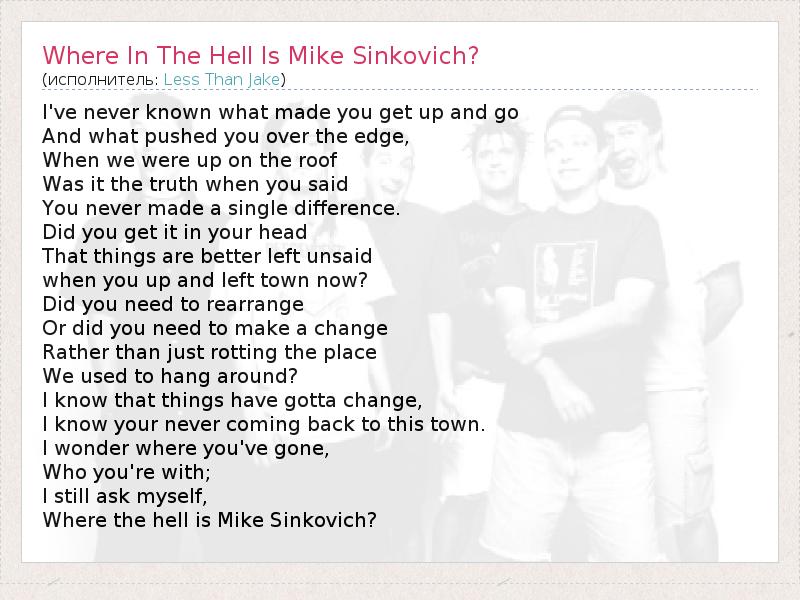 I've never known what made you get up and go And what pushed you over the edge, When we were up on the roof Was it the truth when you said You never made a single difference. Did you get it in your head That things are better left unsaid when you up and left town now? Did you need to rearrange Or did you need to make a change Rather than just rotting the place We used to hang around? I know that things have gotta change, I know your never coming back to this town. I wonder where you've gone, Who you're with; I still ask myself, Where the hell is Mike Sinkovich?