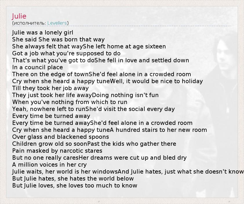 Julie waits, her world is her windowsAnd Julie hates, just what she doesn't know