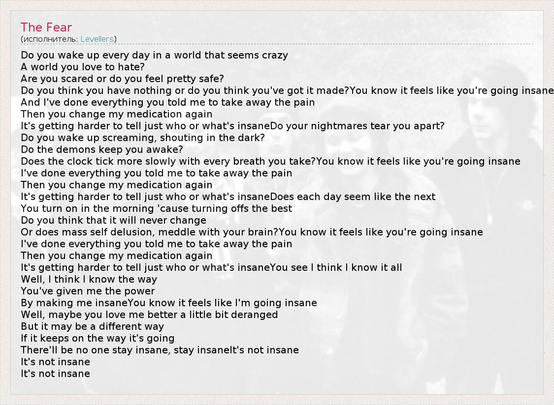 Do you wake up every day in a world that seems crazy A world you love to hate? Are you scared or do you feel pretty safe? Do you think you have nothing or do you think you've got it made?You know it feels like you're going insane And I've done everything you told me to take away the pain Then you change my medication again It's getting harder to tell just who or what's insaneDo your nightmares tear you apart? Do you wake up screaming, shouting in the dark? Do the demons keep you awake? Does the clock tick more slowly with every breath you take?You know it feels like you're going insane I've done everything you told me to take away the pain Then you change my medication again It's getting harder to tell just who or what's insaneDoes each day seem like the next You turn on in the morning 'cause turning offs the best Do you think that it will never change Or does mass self delusion, meddle with your brain?You know it feels like you're going insane I've done everything you told me to take away the pain Then you change my medication again It's getting harder to tell just who or what's insaneYou see I think I know it all Well, I think I know the way You've given me the power By making me insaneYou know it feels like I'm going insane Well, maybe you love me better a little bit deranged But it may be a different way If it keeps on the way it's going There'll be no one stay insane, stay insaneIt's not insane It's not insane It's not insane