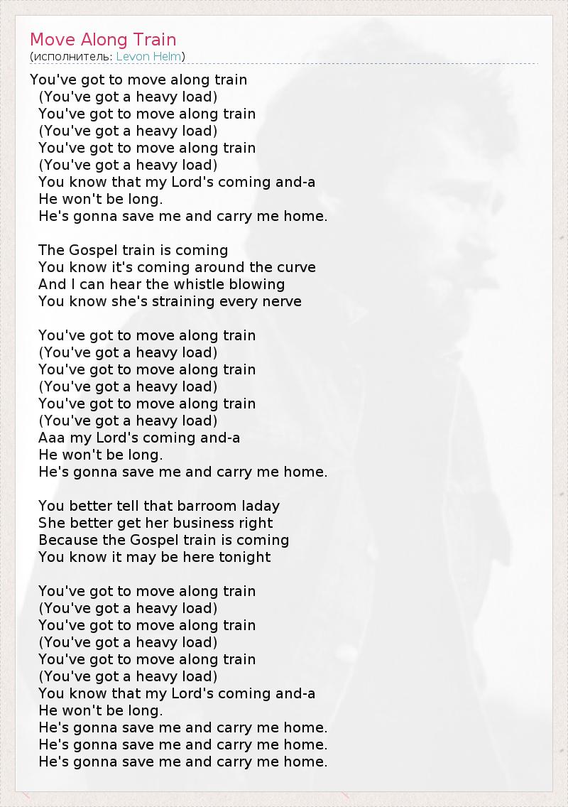 You've got to move along train (You've got a heavy load) You've got to move along train (You've got a heavy load) You've got to move along train (You've got a heavy load) You know that my Lord's coming and-a He won't be long. He's gonna save me and carry me home. The Gospel train is coming You know it's coming around the curve And I can hear the whistle blowing You know she's straining every nerve You've got to move along train (You've got a heavy load) You've got to move along train (You've got a heavy load) You've got to move along train (You've got a heavy load) Aaa my Lord's coming and-a He won't be long. He's gonna save me and carry me home. You better tell that barroom laday She better get her business right Because the Gospel train is coming You know it may be here tonight You've got to move along train (You've got a heavy load) You've got to move along train (You've got a heavy load) You've got to move along train (You've got a heavy load) You know that my Lord's coming and-a He won't be long. He's gonna save me and carry me home. He's gonna save me and carry me home. He's gonna save me and carry me home.