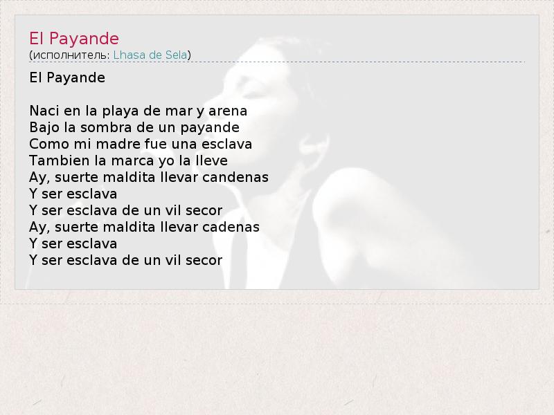El Payande Naci en la playa de mar y arena Bajo la sombra de un payande Como mi madre fue una esclava Tambien la marca yo la lleve Ay, suerte maldita llevar candenas Y ser esclava Y ser esclava de un vil seсor Ay, suerte maldita llevar cadenas Y ser esclava Y ser esclava de un vil seсor