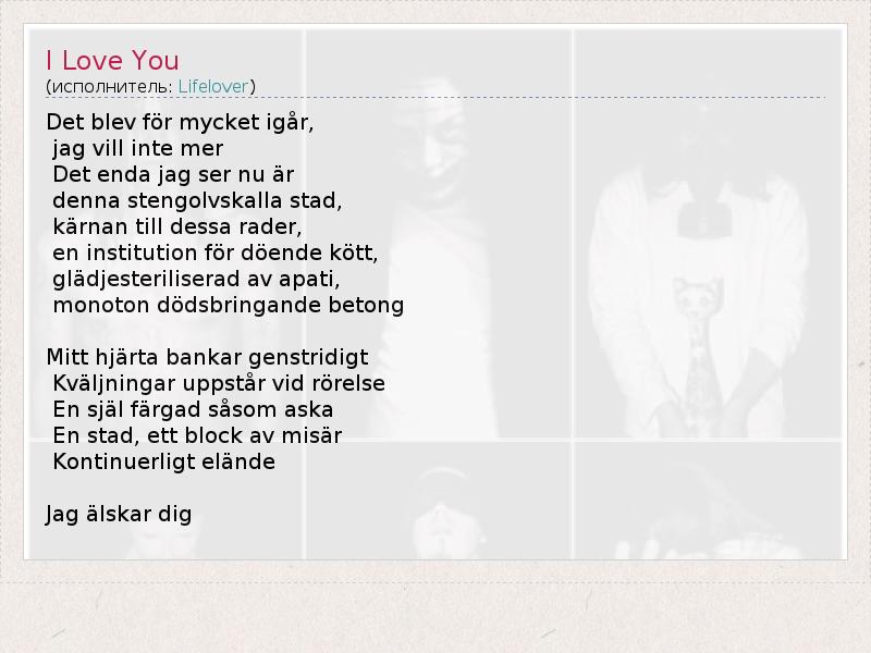 Det blev för mycket igår, jag vill inte mer Det enda jag ser nu är denna stengolvskalla stad, kärnan till dessa rader, en institution för döende kött, glädjesteriliserad av apati, monoton dödsbringande betong Mitt hjärta bankar genstridigt Kväljningar uppstår vid rörelse En själ färgad såsom aska En stad, ett block av misär Kontinuerligt elände Jag älskar dig