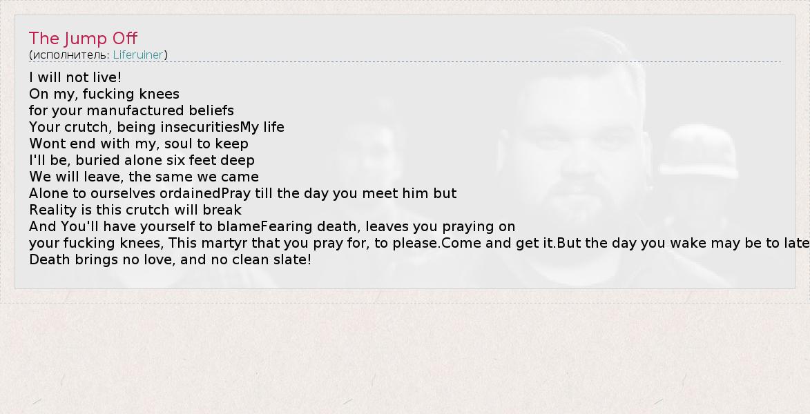 Это интересно:Открыв и поддерживая факт о том, "Кто есть Кто" на современной метал/хардкор сцене уже более двух лет, группа LIFERUINER из Торонто решила, что настало их время оставить свои следы. Их дебютный полноформатник "NoSaints" (2007) спродюсированный Antoinne Lussier ( IonDissonance/Century Media Records) - прямой пример того, чем DIY хардкор должен быть: Брэйкдауны, чудовищные металлические рифы, энергичные шоу и... продолжение
