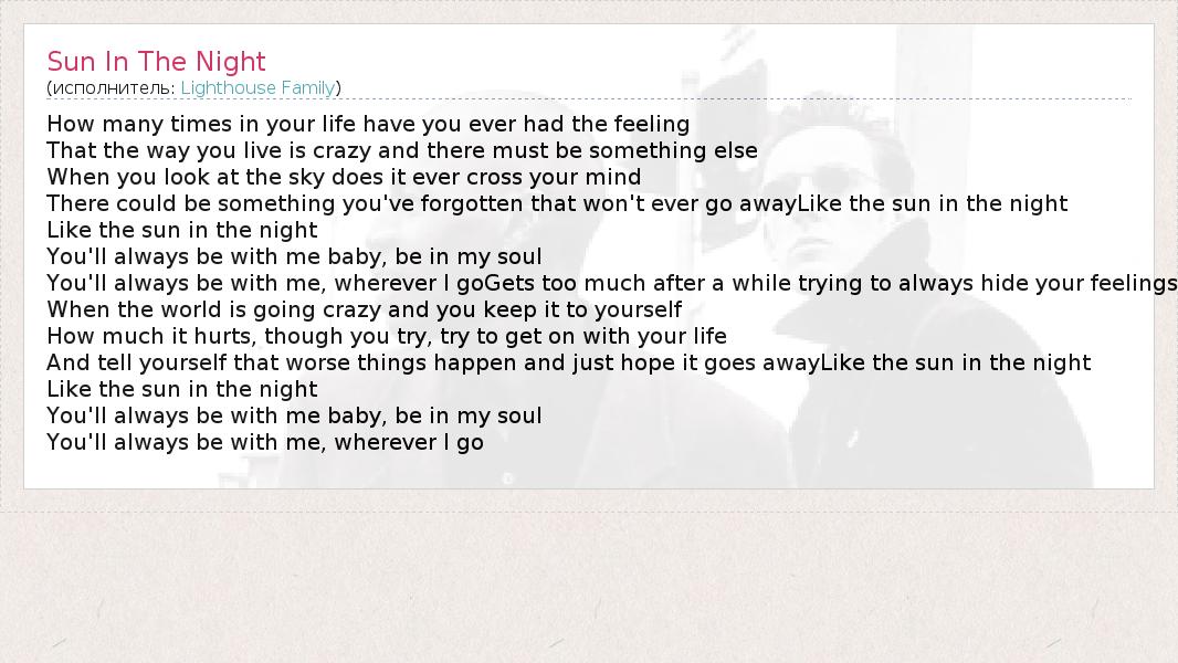 А как ты думаешь, о чем песня "Sun In The Night" ?