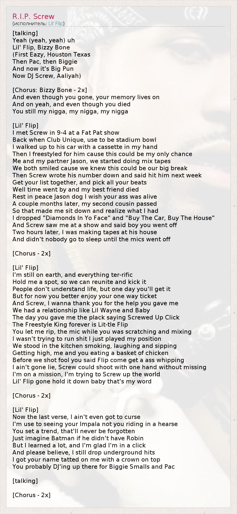 [talking] Yeah (yeah, yeah) uh Lil' Flip, Bizzy Bone (First Eazy, Houston Texas Then Pac, then Biggie And now it's Big Pun Now DJ Screw, Aaliyah) [Chorus: Bizzy Bone - 2x] And even though you gone, your memory lives on And on yeah, and even though you died You still my nigga, my nigga, my nigga [Lil' Flip] I met Screw in 9-4 at a Fat Pat show Back when Club Unique, use to be stadium bowl I walked up to his car with a cassette in my hand Then I freestyled for him cause this could be my only chance Me and my partner Jason, we started doing mix tapes We both smiled cause we knew this could be our big break Then Screw wrote his number down and said hit him next week Get your list together, and pick all your beats Well time went by and my best friend died Rest in peace Jason dog I wish your ass was alive A couple months later, my second cousin passed So that made me sit down and realize what I had I dropped "Diamonds In Yo Face" and "Buy The Car, Buy The House" And Screw saw me at a show and said boy you went off Two hours later, I was making tapes at his house And didn't nobody go to sleep until the mics went off [Chorus - 2x] [Lil' Flip] I'm still on earth, and everything ter-rific Hold me a spot, so we can reunite and kick it People don't understand life, but one day you'll get it But for now you better enjoy your one way ticket And Screw, I wanna thank you for the help you gave me We had a relationship like Lil Wayne and Baby The day you gave me the plack saying Screwed Up Click The Freestyle King forever is Lit-tle Flip You let me rip, the mic while you was scratching and mixing I wasn't trying to run shit I just played my position We stood in the kitchen smoking, laughing and sipping Getting high, me and you eating a basket of chicken Before we shot fool you said Flip come get a ass whipping I ain't gone lie, Screw could shoot with one hand without missing I'm on a mission, I'm trying to Screw up the world Lil' Flip gone hold it down baby that's my word [Chorus - 2x] [Lil' Flip] Now the last verse, I ain't even got to curse I'm use to seeing your Impala not you riding in a hearse You set a trend, that'll never be forgotten Just imagine Batman if he didn't have Robin But I learned a lot, and I'm glad I'm in a click And please believe, I still drop underground hits I got your name tatted on me with a crown on top You probably DJ'ing up there for Biggie Smalls and Pac [talking] [Chorus - 2x]