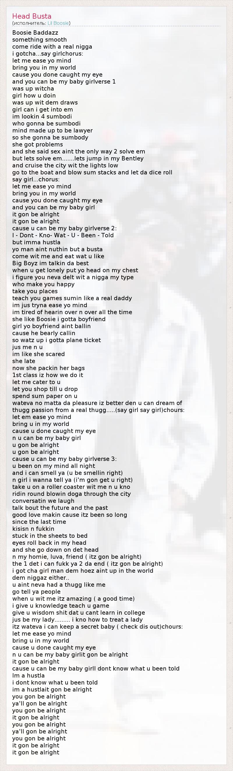 Это интересно:Лил Бусси родился 14-го ноября 1983-го года – в Батон-Руж, в Луизиане. Вырос музыкант на улицах городских «джунглей» - опасных, полных наркотиков и насилия. В свое время Лил увлекся баскетболом и спорт придал жизни Бусси иное направление.Когда музыканту исполнилось четырнадцать лет, он переехал жить к бабушке, так как остался практически сиротой – его отец был убит наркодилерами. Впоследствии,... продолжение