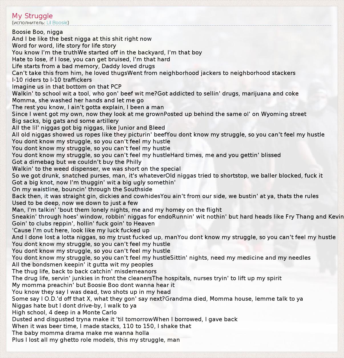 You dont know my struggle, so you can't feel my hustleSittin' nights, need my medicine and my needles