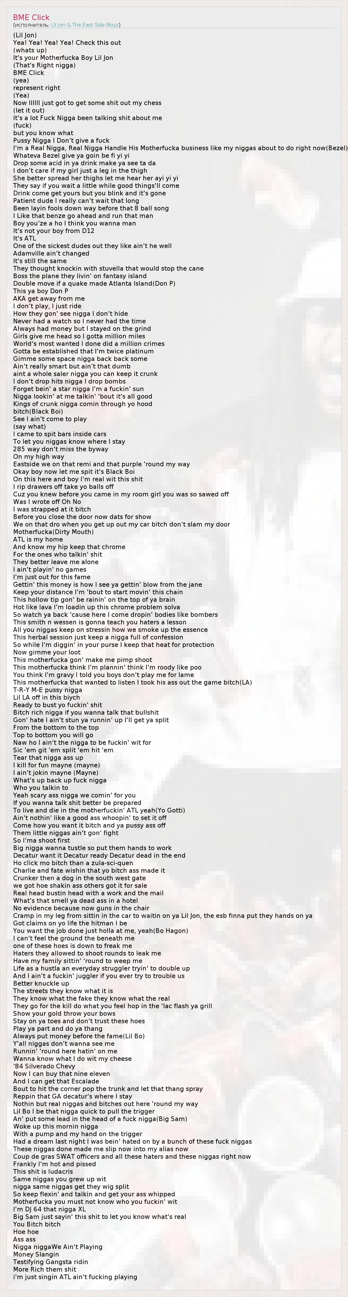 (Lil Jon) Yea! Yea! Yea! Yea! Check this out (whats up) It's your Motherfucka Boy Lil Jon (That's Right nigga) BME Click (yea) represent right (Yea) Now IIIIII just got to get some shit out my chess (let it out) It's a lot Fuck Nigga been talking shit about me (fuck) but you know what Pussy Nigga I Don't give a fuck I'm a Real Nigga, Real Nigga Handle His Motherfucka business like my niggas about to do right now(Bezel) Whateva Bezel give ya goin be fi yi yi Drop some acid in ya drink make ya see ta da I don't care if my girl just a leg in the thigh She better spread her thighs let me hear her ayi yi yi They say if you wait a little while good things'll come Drink come get yours but you blink and it's gone Patient dude I really can't wait that long Been layin fools down way before that 8 ball song I Like that benze go ahead and run that man Boy you'ze a ho I think you wanna man It's not your boy from D12 It's ATL One of the sickest dudes out they like ain't he well Adamville ain't changed It's still the same They thought knockin with stuvella that would stop the cane Boss the plane they livin' on fantasy island Double move if a quake made Atlanta Island(Don P) This ya boy Don P AKA get away from me I don't play, I just ride How they gon' see nigga I don't hide Never had a watch so I never had the time Always had money but I stayed on the grind Girls give me head so I gotta million miles World's most wanted I done did a million crimes Gotta be established that I'm twice platinum Gimme some space nigga back back some Ain't really smart but ain't that dumb aint a whole saler nigga you can keep it crunk I don't drop hits nigga I drop bombs Forget bein' a star nigga I'm a fuckin' sun Nigga lookin' at me talkin' 'bout it's all good Kings of crunk nigga comin through yo hood bitch(Black Boi) See I ain't come to play (say what) I came to spit bars inside cars To let you niggas know where I stay 285 way don't miss the byway On my high way Eastside we on that remi and that purple 'round my way Okay boy now let me spit it's Black Boi On this here and boy I'm real wit this shit I rip drawers off take yo balls off Cuz you knew before you came in my room girl you was so sawed off Was I wrote off Oh No I was strapped at it bitch Before you close the door now dats for show We on that dro when you get up out my car bitch don't slam my door Motherfucka(Dirty Mouth) ATL is my home And know my hip keep that chrome For the ones who talkin' shit They better leave me alone I ain't playin' no games I'm just out for this fame Gettin' this money is how I see ya gettin' blow from the jane Keep your distance I'm 'bout to start movin' this chain This hollow tip gon' be rainin' on the top of ya brain Hot like lava I'm loadin up this chrome problem solva So watch ya back 'cause here I come dropin' bodies like bombers This smith n wessen is gonna teach you haters a lesson All you niggas keep on stressin how we smoke up the essence This herbal session just keep a nigga full of confession So while I'm diggin' in your purse I keep that heat for protection Now gimme your loot This motherfucka gon' make me pimp shoot This motherfucka think I'm plannin' think I'm roody like poo You think I'm gravy I told you boys don't play me for lame This motherfucka that wanted to listen I took his ass out the game bitch(LA) T-R-Y M-E pussy nigga Lil LA off in this biych Ready to bust yo fuckin' shit Bitch rich nigga if you wanna talk that bullshit Gon' hate I ain't stun ya runnin' up I'll get ya split From the bottom to the top Top to bottom you will go Naw ho I ain't the nigga to be fuckin' wit for Sic 'em git 'em split 'em hit 'em Tear that nigga ass up I kill for fun mayne (mayne) I ain't jokin mayne (Mayne) What's up back up fuck nigga Who you talkin to Yeah scary ass nigga we comin' for you If you wanna talk shit better be prepared To live and die in the motherfuckin' ATL yeah(Yo Gotti) Ain't nothin' like a good ass whoopin' to set it off Come how you want it bitch and ya pussy ass off Them little niggas ain't gon' fight So I'ma shoot first Big nigga wanna tustle so put them hands to work Decatur want it Decatur ready Decatur dead in the end Ho click mo bitch than a zula-sci-quen Charlie and fate wishin that yo bitch ass made it Crunker then a dog in the south west gate we got hoe shakin ass others got it for sale Real head bustin head with a work and the mail What's that smell ya dead ass in a hotel No evidence because now guns in the chair Cramp in my leg from sittin in the car to waitin on ya Lil Jon, the esb finna put they hands on ya Got claims on yo life the hitman I be You want the job done just holla at me, yeah(Bo Hagon) I can't feel the ground the beneath me one of these hoes is down to freak me Haters they allowed to shoot rounds to leak me Have my family sittin' 'round to weep me Life as a hustla an everyday struggler tryin' to double up And I ain't a fuckin' juggler if you ever try to trouble us Better knuckle up The streets they know what it is They know what the fake they know what the real They go for the kill do what you feel hop in the 'lac flash ya grill Show your gold throw your bows Stay on ya toes and don't trust these hoes Play ya part and do ya thang Always put money before the fame(Lil Bo) Y'all niggas don't wanna see me Runnin' 'round here hatin' on me Wanna know what I do wit my cheese '84 Silverado Chevy Now I can buy that nine eleven And I can get that Escalade Bout to hit the corner pop the trunk and let that thang spray Reppin that GA decatur's where I stay Nothin but real niggas and bitches out here 'round my way Lil Bo I be that nigga quick to pull the trigger An' put some lead in the head of a fuck nigga(Big Sam) Woke up this mornin nigga With a pump and my hand on the trigger Had a dream last night I was bein' hated on by a bunch of these fuck niggas These niggas done made me slip now into my alias now Coup de gras SWAT officers and all these haters and these niggas right now Frankly I'm hot and pis