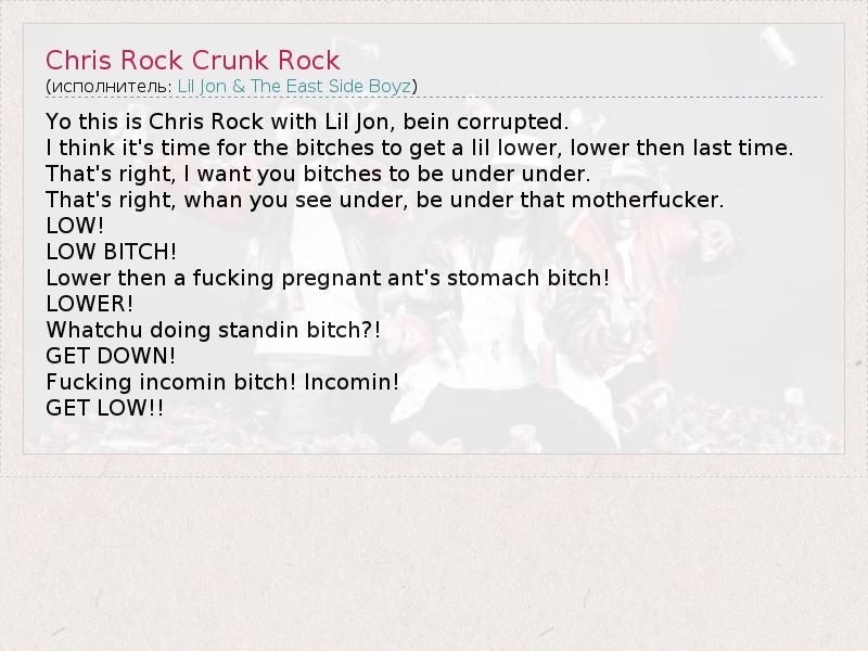 А как ты думаешь, о чем песня "Chris Rock Crunk Rock" ?