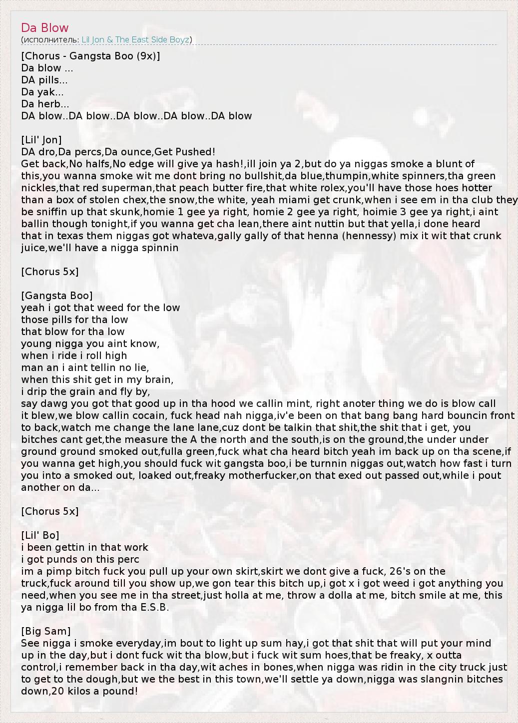 [Chorus - Gangsta Boo (9x)] Da blow ... DA pills... Da yak... Da herb... DA blow..DA blow..DA blow..DA blow..DA blow [Lil' Jon] DA dro,Da percs,Da ounce,Get Pushed! Get back,No halfs,No edge will give ya hash!,ill join ya 2,but do ya niggas smoke a blunt of this,you wanna smoke wit me dont bring no bullshit,da blue,thumpin,white spinners,tha green nickles,that red superman,that peach butter fire,that white rolex,you'll have those hoes hotter than a box of stolen chex,the snow,the white, yeah miami get crunk,when i see em in tha club they be sniffin up that skunk,homie 1 gee ya right, homie 2 gee ya right, hoimie 3 gee ya right,i aint ballin though tonight,if you wanna get cha lean,there aint nuttin but that yella,i done heard that in texas them niggas got whateva,gally gally of that henna (hennessy) mix it wit that crunk juice,we'll have a nigga spinnin [Chorus 5x] [Gangsta Boo] yeah i got that weed for the low those pills for tha low that blow for tha low young nigga you aint know, when i ride i roll high man an i aint tellin no lie, when this shit get in my brain, i drip the grain and fly by, say dawg you got that good up in tha hood we callin mint, right anoter thing we do is blow call it blew,we blow callin cocain, fuck head nah nigga,iv'e been on that bang bang hard bouncin front to back,watch me change the lane lane,cuz dont be talkin that shit,the shit that i get, you bitches cant get,the measure the A the north and the south,is on the ground,the under under ground ground smoked out,fulla green,fuck what cha heard bitch yeah im back up on tha scene,if you wanna get high,you should fuck wit gangsta boo,i be turnnin niggas out,watch how fast i turn you into a smoked out, loaked out,freaky motherfucker,on that exed out passed out,while i pout another on da... [Chorus 5x] [Lil' Bo] i been gettin in that work i got punds on this perc im a pimp bitch fuck you pull up your own skirt,skirt we dont give a fuck, 26's on the truck,fuck around till you show up,we gon tear this bitch up,i got x i got weed i got anything you need,when you see me in tha street,just holla at me, throw a dolla at me, bitch smile at me, this ya nigga lil bo from tha E.S.B. [Big Sam] See nigga i smoke everyday,im bout to light up sum hay,i got that shit that will put your mind up in the day,but i dont fuck wit tha blow,but i fuck wit sum hoes,that be freaky, x outta control,i remember back in tha day,wit aches in bones,when nigga was ridin in the city truck just to get to the dough,but we the best in this town,we'll settle ya down,nigga was slangnin bitches down,20 kilos a pound!