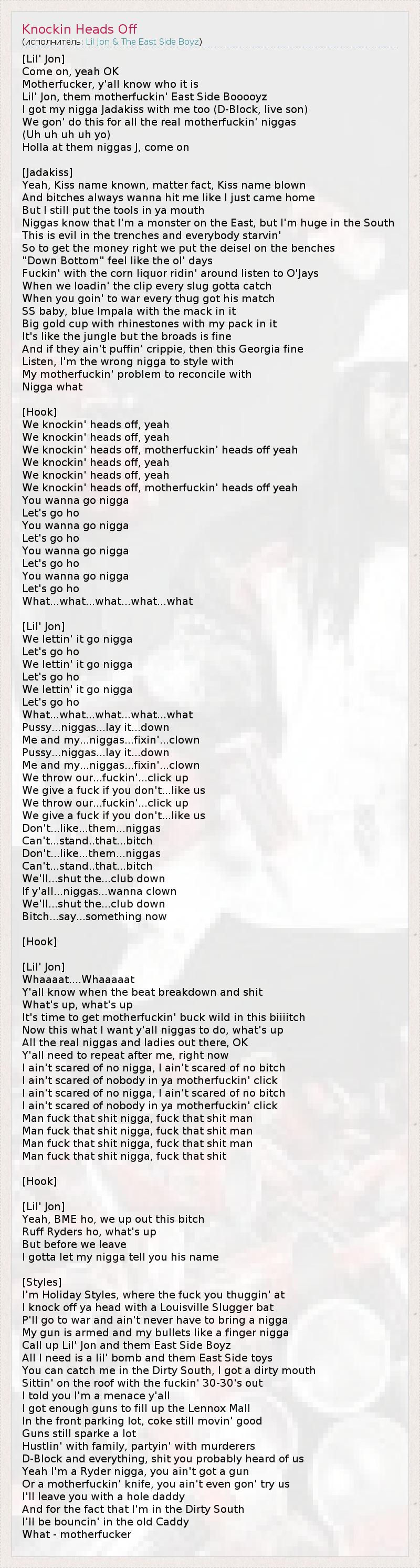 [Lil' Jon] Come on, yeah OK Motherfucker, y'all know who it is Lil' Jon, them motherfuckin' East Side Booooyz I got my nigga Jadakiss with me too (D-Block, live son) We gon' do this for all the real motherfuckin' niggas (Uh uh uh uh yo) Holla at them niggas J, come on [Jadakiss] Yeah, Kiss name known, matter fact, Kiss name blown And bitches always wanna hit me like I just came home But I still put the tools in ya mouth Niggas know that I'm a monster on the East, but I'm huge in the South This is evil in the trenches and everybody starvin' So to get the money right we put the deisel on the benches "Down Bottom" feel like the ol' days Fuckin' with the corn liquor ridin' around listen to O'Jays When we loadin' the clip every slug gotta catch When you goin' to war every thug got his match SS baby, blue Impala with the mack in it Big gold cup with rhinestones with my pack in it It's like the jungle but the broads is fine And if they ain't puffin' crippie, then this Georgia fine Listen, I'm the wrong nigga to style with My motherfuckin' problem to reconcile with Nigga what [Hook] We knockin' heads off, yeah We knockin' heads off, yeah We knockin' heads off, motherfuckin' heads off yeah We knockin' heads off, yeah We knockin' heads off, yeah We knockin' heads off, motherfuckin' heads off yeah You wanna go nigga Let's go ho You wanna go nigga Let's go ho You wanna go nigga Let's go ho You wanna go nigga Let's go ho What...what...what...what...what [Lil' Jon] We lettin' it go nigga Let's go ho We lettin' it go nigga Let's go ho We lettin' it go nigga Let's go ho What...what...what...what...what Pussy...niggas...lay it...down Me and my...niggas...fixin'...clown Pussy...niggas...lay it...down Me and my...niggas...fixin'...clown We throw our...fuckin'...click up We give a fuck if you don't...like us We throw our...fuckin'...click up We give a fuck if you don't...like us Don't...like...them...niggas Can't...stand..that...bitch Don't...like...them...niggas Can't...stand..that...bitch We'll...shut the...club down If y'all...niggas...wanna clown We'll...shut the...club down Bitch...say...something now [Hook] [Lil' Jon] Whaaaat....Whaaaaat Y'all know when the beat breakdown and shit What's up, what's up It's time to get motherfuckin' buck wild in this biiiitch Now this what I want y'all niggas to do, what's up All the real niggas and ladies out there, OK Y'all need to repeat after me, right now I ain't scared of no nigga, I ain't scared of no bitch I ain't scared of nobody in ya motherfuckin' click I ain't scared of no nigga, I ain't scared of no bitch I ain't scared of nobody in ya motherfuckin' click Man fuck that shit nigga, fuck that shit man Man fuck that shit nigga, fuck that shit man Man fuck that shit nigga, fuck that shit man Man fuck that shit nigga, fuck that shit [Hook] [Lil' Jon] Yeah, BME ho, we up out this bitch Ruff Ryders ho, what's up But before we leave I gotta let my nigga tell you his name [Styles] I'm Holiday Styles, where the fuck you thuggin' at I knock off ya head with a Louisville Slugger bat P'll go to war and ain't never have to bring a nigga My gun is armed and my bullets like a finger nigga Call up Lil' Jon and them East Side Boyz All I need is a lil' bomb and them East Side toys You can catch me in the Dirty South, I got a dirty mouth Sittin' on the roof with the fuckin' 30-30's out I told you I'm a menace y'all I got enough guns to fill up the Lennox Mall In the front parking lot, coke still movin' good Guns still sparke a lot Hustlin' with family, partyin' with murderers D-Block and everything, shit you probably heard of us Yeah I'm a Ryder nigga, you ain't got a gun Or a motherfuckin' knife, you ain't even gon' try us I'll leave you with a hole daddy And for the fact that I'm in the Dirty South I'll be bouncin' in the old Caddy What - motherfucker