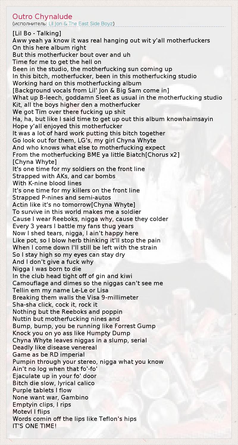 [Lil Bo - Talking] Aww yeah ya know it was real hanging out wit y'all motherfuckers On this here album right But this motherfucker bout over and uh Time for me to get the hell on Been in the studio, the motherfucking sun coming up In this bitch, motherfucker, been in this motherfucking studio Working hard on this motherfucking album [Background vocals from Lil' Jon & Big Sam come in] What up B-leech, goddamn Sleet as usual in the motherfucking studio Kit, all the boys higher den a motherfucker We got Tim over there fucking up shit Ha, ha, but like I said time to get up out this album knowhaimsayin Hope y'all enjoyed this motherfucker It was a lot of hard work putting this bitch together Go look out for them, LG's, my girl Chyna Whyte And who knows what else to motherfucking expect From the motherfucking BME ya little Biatch[Chorus x2] [Chyna Whyte] It's one time for my soldiers on the front line Strapped with AKs, and car bombs With K-nine blood lines It's one time for my killers on the front line Strapped P-nines and semi-autos Actin like it's no tomorrow[Chyna Whyte] To survive in this world makes me a soldier Cause I wear Reeboks, nigga why, cause they colder Every 3 years I battle my fans thug years Now I shed tears, nigga, I ain't happy here Like pot, so I blow herb thinking it'll stop the pain When I come down I'll still be left with the strain So I stay high so my eyes can stay dry And I don't give a fuck why Nigga I was born to die In the club head tight off of gin and kiwi Camouflage and dimes so the niggas can't see me Tellin em my name Le-Le or Lisa Breaking them walls the Visa 9-millimeter Sha-sha click, cock it, rock it Nothing but the Reeboks and poppin Nuttin but motherfucking nines and Bump, bump, you be running like Forrest Gump Knock you on yo ass like Humpty Dump Chyna Whyte leaves niggas in a slump, serial Deadly like disease venereal Game as be RD imperial Pumpin through your stereo, nigga what you know Ain't no log when that fo'-fo' Ejaculate up in your fo' door Bitch die slow, lyrical calico Purple tablets I flow None want war, Gambino Emptyin clips, I rips Motevl I flips Words comin off the lips like Teflon's hips IT'S ONE TIME!