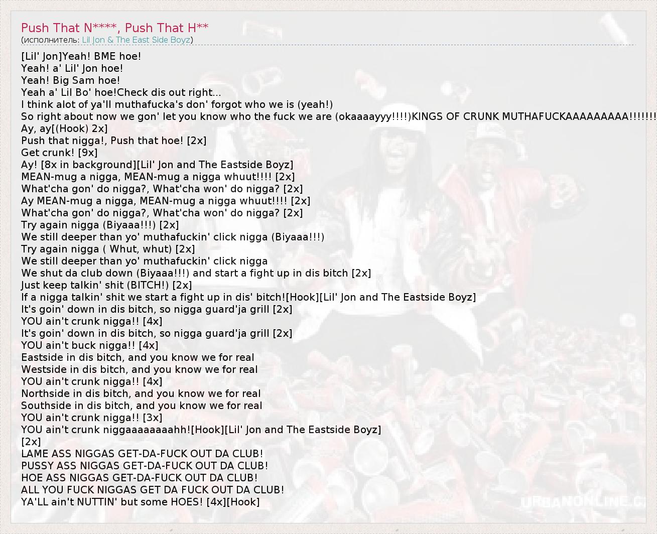[Lil' Jon]Yeah! BME hoe! Yeah! a' Lil' Jon hoe! Yeah! Big Sam hoe! Yeah a' Lil Bo' hoe!Check dis out right... I think alot of ya'll muthafucka's don' forgot who we is (yeah!) So right about now we gon' let you know who the fuck we are (okaaaayyy!!!!)KINGS OF CRUNK MUTHAFUCKAAAAAAAAA!!!!!!! Ay, ay[(Hook) 2x] Push that nigga!, Push that hoe! [2x] Get crunk! [9x] Ay! [8x in background][Lil' Jon and The Eastside Boyz] MEAN-mug a nigga, MEAN-mug a nigga whuut!!!! [2x] What'cha gon' do nigga?, What'cha won' do nigga? [2x] Ay MEAN-mug a nigga, MEAN-mug a nigga whuut!!!! [2x] What'cha gon' do nigga?, What'cha won' do nigga? [2x] Try again nigga (Biyaaa!!!) [2x] We still deeper than yo' muthafuckin' click nigga (Biyaaa!!!) Try again nigga ( Whut, whut) [2x] We still deeper than yo' muthafuckin' click nigga We shut da club down (Biyaaa!!!) and start a fight up in dis bitch [2x] Just keep talkin' shit (BITCH!) [2x] If a nigga talkin' shit we start a fight up in dis' bitch![Hook][Lil' Jon and The Eastside Boyz] It's goin' down in dis bitch, so nigga guard'ja grill [2x] YOU ain't crunk nigga!! [4x] It's goin' down in dis bitch, so nigga guard'ja grill [2x] YOU ain't buck nigga!! [4x] Eastside in dis bitch, and you know we for real Westside in dis bitch, and you know we for real YOU ain't crunk nigga!! [4x] Northside in dis bitch, and you know we for real Southside in dis bitch, and you know we for real YOU ain't crunk nigga!! [3x] YOU ain't crunk niggaaaaaaaahh![Hook][Lil' Jon and The Eastside Boyz] [2x] LAME ASS NIGGAS GET-DA-FUCK OUT DA CLUB! PUSSY ASS NIGGAS GET-DA-FUCK OUT DA CLUB! HOE ASS NIGGAS GET-DA-FUCK OUT DA CLUB! ALL YOU FUCK NIGGAS GET DA FUCK OUT DA CLUB! YA'LL ain't NUTTIN' but some HOES! [4x][Hook]