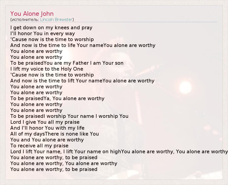 I get down on my knees and pray I'll honor You in every way 'Cause now is the time to worship And now is the time to life Your nameYou alone are worthy You alone are worthy You alone are worthy To be praisedYou are my Father I am Your son I lift my voice to the Holy One 'Cause now is the time to worship And now is the time to lift Your nameYou alone are worthy You alone are worthy You alone are worthy To be praisedYa, You alone are worthy You alone are worthy You alone are worthy To be praisedI worship Your name I worship You Lord I give You all my praise And I'll honor You with my life All of my daysThere is none like You You and You alone are worthy To receive all my praise Lord I lift Your name, I lift Your name on highYou alone are worthy, You alone are worthy You alone are worthy, to be praised You alone are worthy, You alone are worthy You alone are worthy, to be praised