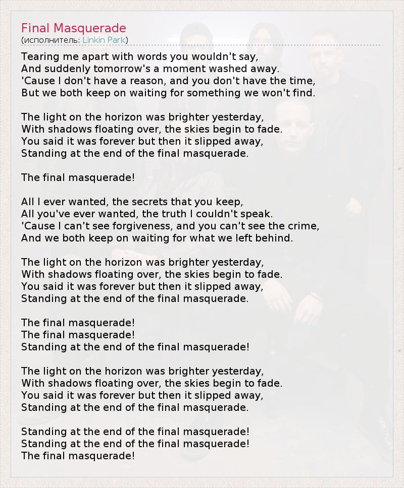 Tearing me apart with words you wouldn't say, And suddenly tomorrow's a moment washed away. 'Cause I don't have a reason, and you don't have the time, But we both keep on waiting for something we won't find. The light on the horizon was brighter yesterday, With shadows floating over, the skies begin to fade. You said it was forever but then it slipped away, Standing at the end of the final masquerade. The final masquerade! All I ever wanted, the secrets that you keep, All you've ever wanted, the truth I couldn't speak. 'Cause I can't see forgiveness, and you can't see the crime, And we both keep on waiting for what we left behind. The light on the horizon was brighter yesterday, With shadows floating over, the skies begin to fade. You said it was forever but then it slipped away, Standing at the end of the final masquerade. The final masquerade! The final masquerade! Standing at the end of the final masquerade! The light on the horizon was brighter yesterday, With shadows floating over, the skies begin to fade. You said it was forever but then it slipped away, Standing at the end of the final masquerade. Standing at the end of the final masquerade! Standing at the end of the final masquerade! The final masquerade!