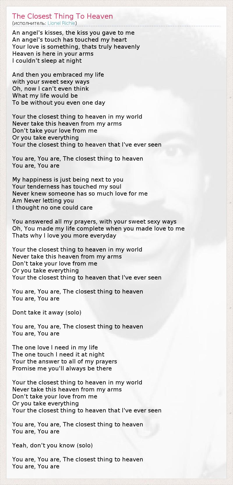 А как ты думаешь, о чем песня "The Closest Thing To Heaven" ?