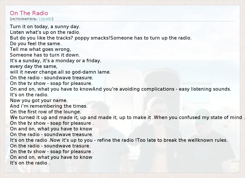 Turn it on today, a sunny day. Listen what's up on the radio. But do you like the tracks? poppy smacks!Someone has to turn up the radio. Do you feel the same. Tell me what goes wrong, Someone has to turn it down. It's a sunday, it's a monday or a friday. every day the same, will it never change.all so god-damn lame. On the radio - soundwave treasure. On the tv show - soap for pleasure. On and on, what you have to knowAnd you're avoiding complications - easy listening sounds. It's on the radio. Now you got your name. And i'm remembering the times. On the first row of the lounge. We turned it up and made it, up and made it, up to make it .When you confused my state of mind . On the tv show - soap for pleasure . On and on, what you have to know On the radio - soundwave treasure. It's on the radio .Now it's up to you - refine the radio !Too late to break the wellknown rules. On the radio - soundwave trasure. On the tv show - soap for pleasure . On and on, what you have to know It's on the radio .
