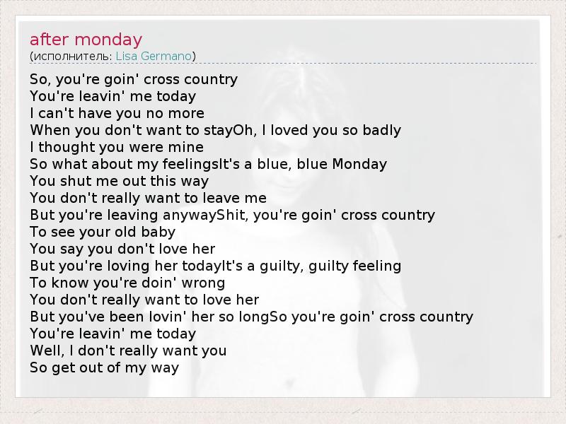 So, you're goin' cross country You're leavin' me today I can't have you no more When you don't want to stayOh, I loved you so badly I thought you were mine So what about my feelingsIt's a blue, blue Monday You shut me out this way You don't really want to leave me But you're leaving anywayShit, you're goin' cross country To see your old baby You say you don't love her But you're loving her todayIt's a guilty, guilty feeling To know you're doin' wrong You don't really want to love her But you've been lovin' her so longSo you're goin' cross country You're leavin' me today Well, I don't really want you So get out of my way