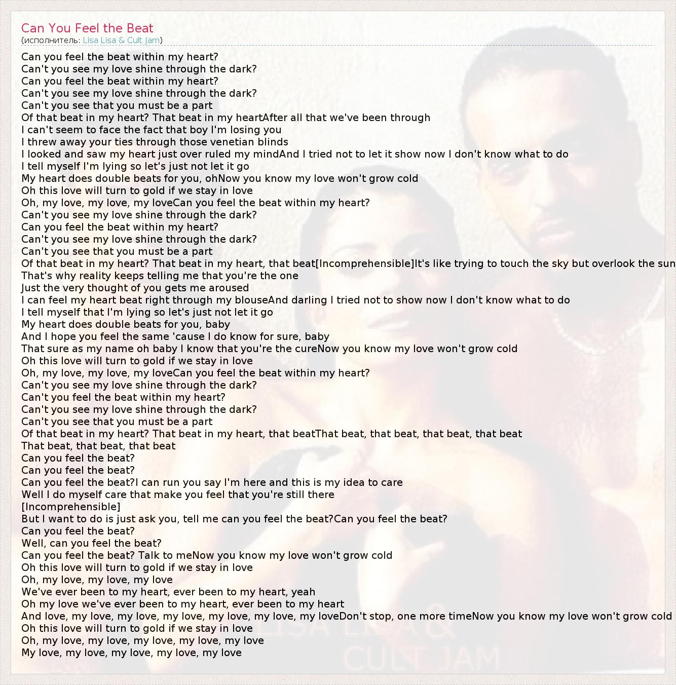 Can you feel the beat within my heart? Can't you see my love shine through the dark? Can you feel the beat within my heart? Can't you see my love shine through the dark? Can't you see that you must be a part Of that beat in my heart? That beat in my heartAfter all that we've been through I can't seem to face the fact that boy I'm losing you I threw away your ties through those venetian blinds I looked and saw my heart just over ruled my mindAnd I tried not to let it show now I don't know what to do I tell myself I'm lying so let's just not let it go My heart does double beats for you, ohNow you know my love won't grow cold Oh this love will turn to gold if we stay in love Oh, my love, my love, my loveCan you feel the beat within my heart? Can't you see my love shine through the dark? Can you feel the beat within my heart? Can't you see my love shine through the dark? Can't you see that you must be a part Of that beat in my heart? That beat in my heart, that beat[Incomprehensible]It's like trying to touch the sky but overlook the sun That's why reality keeps telling me that you're the one Just the very thought of you gets me aroused I can feel my heart beat right through my blouseAnd darling I tried not to show now I don't know what to do I tell myself that I'm lying so let's just not let it go My heart does double beats for you, baby And I hope you feel the same 'cause I do know for sure, baby That sure as my name oh baby I know that you're the cureNow you know my love won't grow cold Oh this love will turn to gold if we stay in love Oh, my love, my love, my loveCan you feel the beat within my heart? Can't you see my love shine through the dark? Can't you feel the beat within my heart? Can't you see my love shine through the dark? Can't you see that you must be a part Of that beat in my heart? That beat in my heart, that beatThat beat, that beat, that beat, that beat That beat, that beat, that beat Can you feel the beat? Can you feel the beat? Can you feel the beat?I can run you say I'm here and this is my idea to care Well I do myself care that make you feel that you're still there [Incomprehensible] But I want to do is just ask you, tell me can you feel the beat?Can you feel the beat? Can you feel the beat? Well, can you feel the beat? Can you feel the beat? Talk to meNow you know my love won't grow cold Oh this love will turn to gold if we stay in love Oh, my love, my love, my love We've ever been to my heart, ever been to my heart, yeah Oh my love we've ever been to my heart, ever been to my heart And love, my love, my love, my love, my love, my love, my loveDon't stop, one more timeNow you know my love won't grow cold Oh this love will turn to gold if we stay in love Oh, my love, my love, my love, my love, my love My love, my love, my love, my love, my love