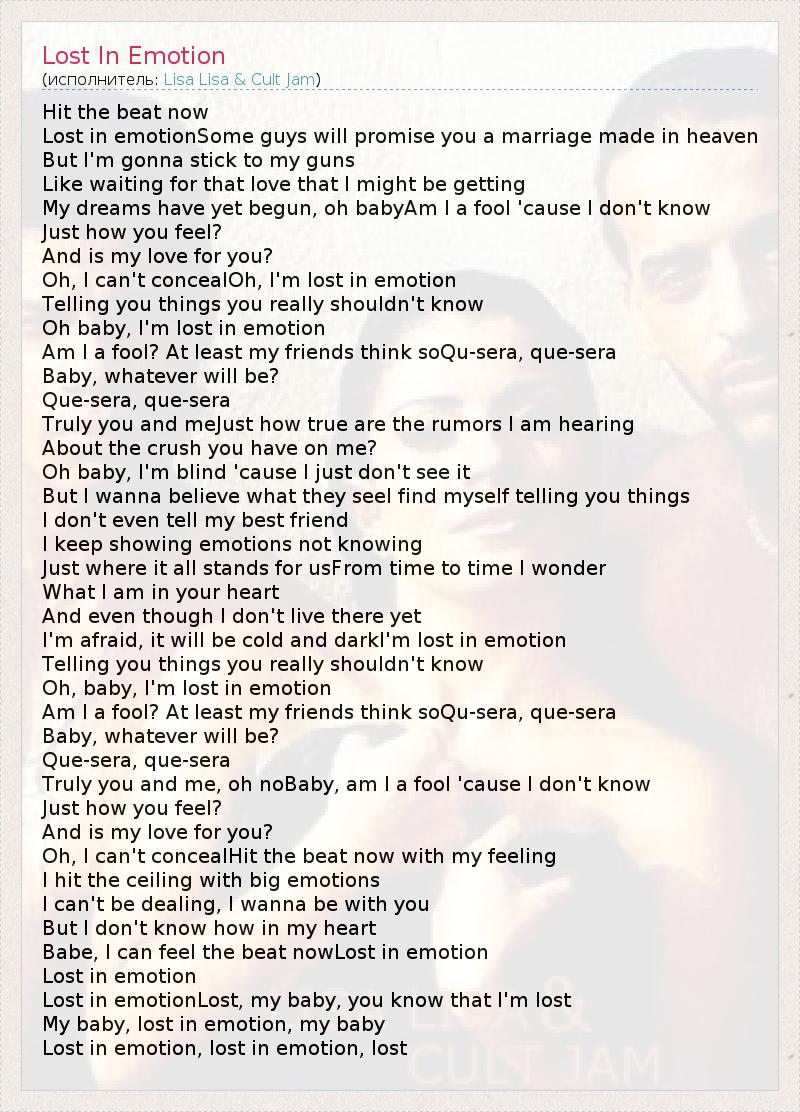 Hit the beat now Lost in emotionSome guys will promise you a marriage made in heaven But I'm gonna stick to my guns Like waiting for that love that I might be getting My dreams have yet begun, oh babyAm I a fool 'cause I don't know Just how you feel? And is my love for you? Oh, I can't concealOh, I'm lost in emotion Telling you things you really shouldn't know Oh baby, I'm lost in emotion Am I a fool? At least my friends think soQu-sera, que-sera Baby, whatever will be? Que-sera, que-sera Truly you and meJust how true are the rumors I am hearing About the crush you have on me? Oh baby, I'm blind 'cause I just don't see it But I wanna believe what they seeI find myself telling you things I don't even tell my best friend I keep showing emotions not knowing Just where it all stands for usFrom time to time I wonder What I am in your heart And even though I don't live there yet I'm afraid, it will be cold and darkI'm lost in emotion Telling you things you really shouldn't know Oh, baby, I'm lost in emotion Am I a fool? At least my friends think soQu-sera, que-sera Baby, whatever will be? Que-sera, que-sera Truly you and me, oh noBaby, am I a fool 'cause I don't know Just how you feel? And is my love for you? Oh, I can't concealHit the beat now with my feeling I hit the ceiling with big emotions I can't be dealing, I wanna be with you But I don't know how in my heart Babe, I can feel the beat nowLost in emotion Lost in emotion Lost in emotionLost, my baby, you know that I'm lost My baby, lost in emotion, my baby Lost in emotion, lost in emotion, lost