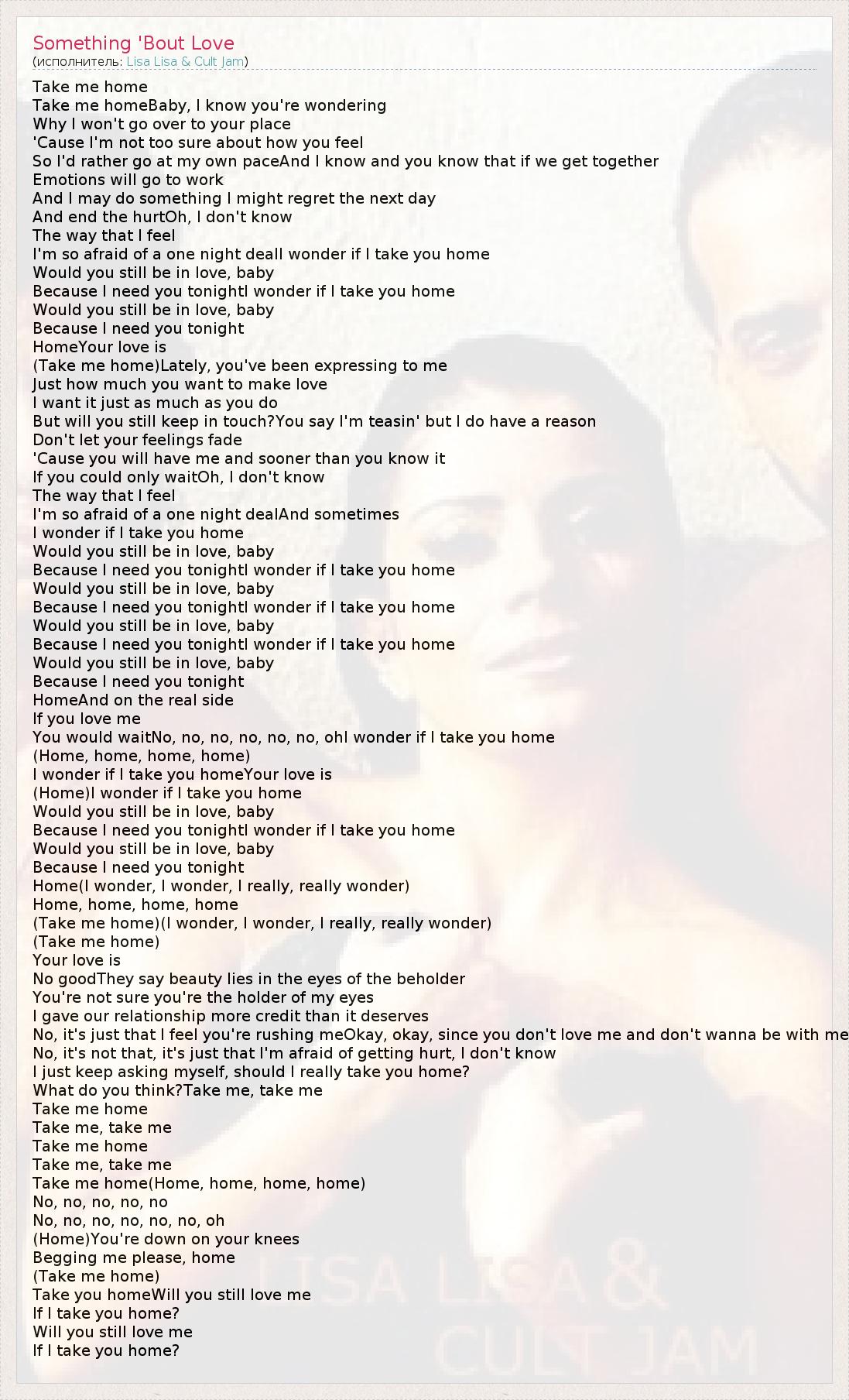 Это интересно:Lisa Lisa (родилась Lisa Velez, 15 января 1967) и ее група Cult Jam была американской пуэрто-риканской группой и одной из оригинальных freestyle групп 1980-ых. Cult Jam состояла из гитариста/басиста Алекса "Spanador" Moseley, и барабанщика/музыканта, играющего на клавишных инструментах Mike Hughes. Их поддержывала и записывала студия Full Force.Группа выпустила их дебютный альбом Lisa Lisa & Cult Jam с Full Force в 1985. Personal Records label... продолжение