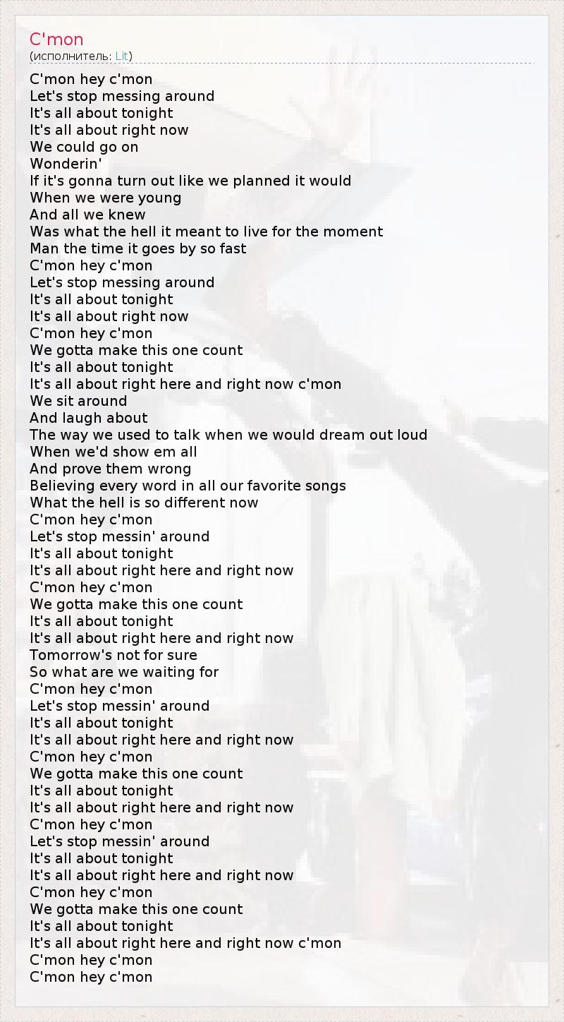 Это интересно:Начало 90-х, Orange County, California… В этом месте и в это время мир увидели множество новых панк-комманд, которые на волне успеха "монстров жанра" впоследствии достигли заметного успеха. Одной из таких групп стали четверо парней, назвавшие себя Lit и принявшиеся деловито играть некую смесь поп-панка с гранджем.Прямо скажем, дела группы шли с очень умеренным успехом до тех пока в 1999 году... продолжение