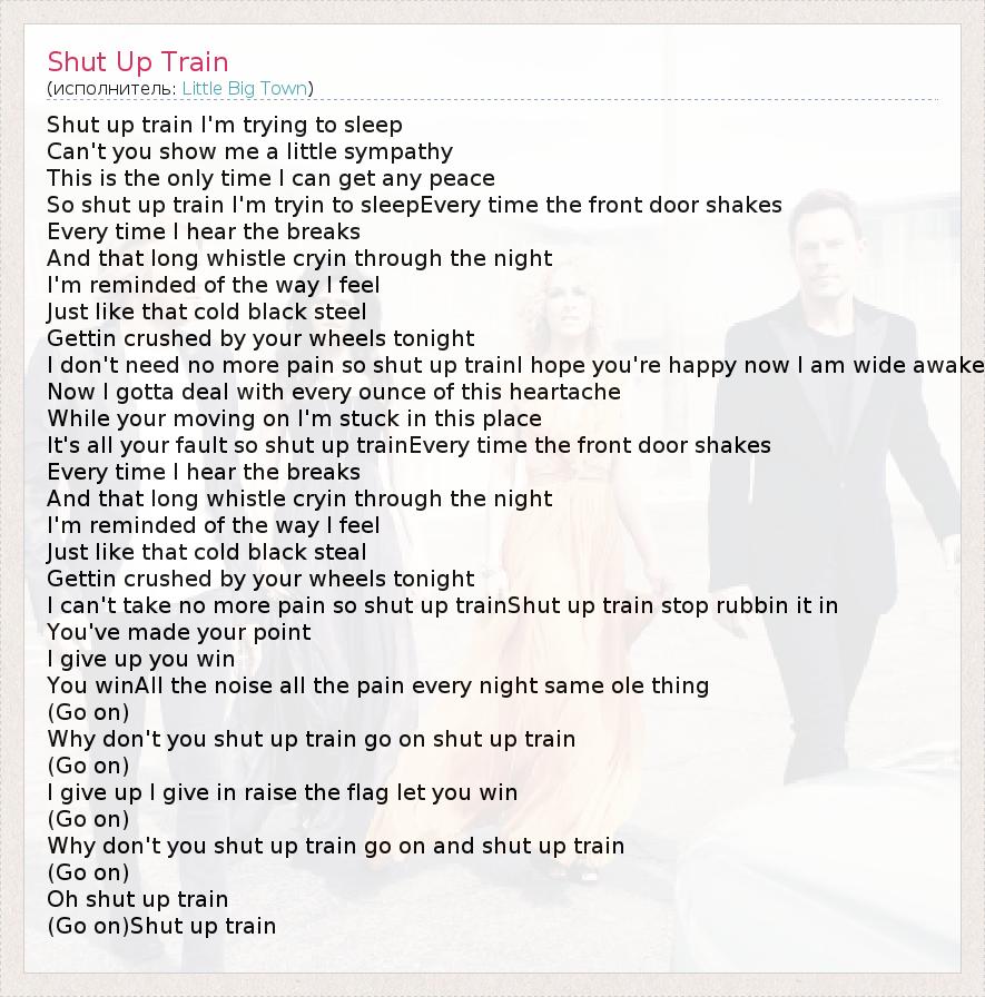 Shut up train I'm trying to sleep Can't you show me a little sympathy This is the only time I can get any peace So shut up train I'm tryin to sleepEvery time the front door shakes Every time I hear the breaks And that long whistle cryin through the night I'm reminded of the way I feel Just like that cold black steel Gettin crushed by your wheels tonight I don't need no more pain so shut up trainI hope you're happy now I am wide awake Now I gotta deal with every ounce of this heartache While your moving on I'm stuck in this place It's all your fault so shut up trainEvery time the front door shakes Every time I hear the breaks And that long whistle cryin through the night I'm reminded of the way I feel Just like that cold black steal Gettin crushed by your wheels tonight I can't take no more pain so shut up trainShut up train stop rubbin it in You've made your point I give up you win You winAll the noise all the pain every night same ole thing (Go on) Why don't you shut up train go on shut up train (Go on) I give up I give in raise the flag let you win (Go on) Why don't you shut up train go on and shut up train (Go on) Oh shut up train (Go on)Shut up train
