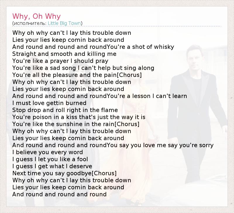Why oh why can't I lay this trouble down Lies your lies keep comin back around And round and round and roundYou're a shot of whisky Straight and smooth and killing me You're like a prayer I should pray You're like a sad song I can't help but sing along You're all the pleasure and the pain[Chorus] Why oh why can't I lay this trouble down Lies your lies keep comin back around And round and round and roundYou're a lesson I can't learn I must love gettin burned Stop drop and roll right in the flame You're poison in a kiss that's just the way it is You're like the sunshine in the rain[Chorus] Why oh why can't I lay this trouble down Lies your lies keep comin back around And round and round and roundYou say you love me say you're sorry I believe you every word I guess I let you like a fool I guess I get what I deserve Next time you say goodbye[Chorus] Why oh why can't I lay this trouble down Lies your lies keep comin back around And round and round and round
