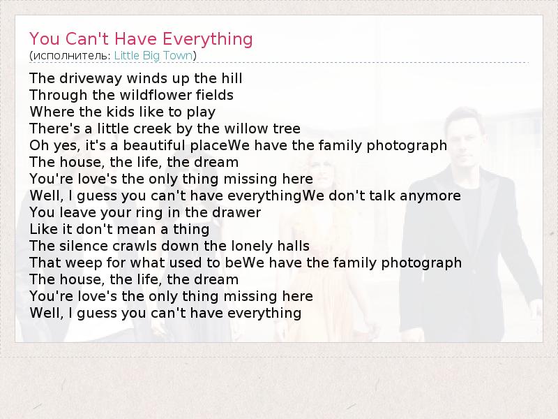 А как ты думаешь, о чем песня "You Can't Have Everything" ?