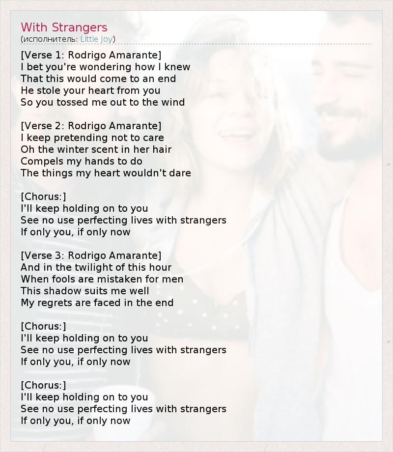 [Verse 1: Rodrigo Amarante] I bet you're wondering how I knew That this would come to an end He stole your heart from you So you tossed me out to the wind [Verse 2: Rodrigo Amarante] I keep pretending not to care Oh the winter scent in her hair Compels my hands to do The things my heart wouldn't dare [Chorus:] I'll keep holding on to you See no use perfecting lives with strangers If only you, if only now [Verse 3: Rodrigo Amarante] And in the twilight of this hour When fools are mistaken for men This shadow suits me well My regrets are faced in the end [Chorus:] I'll keep holding on to you See no use perfecting lives with strangers If only you, if only now [Chorus:] I'll keep holding on to you See no use perfecting lives with strangers If only you, if only now