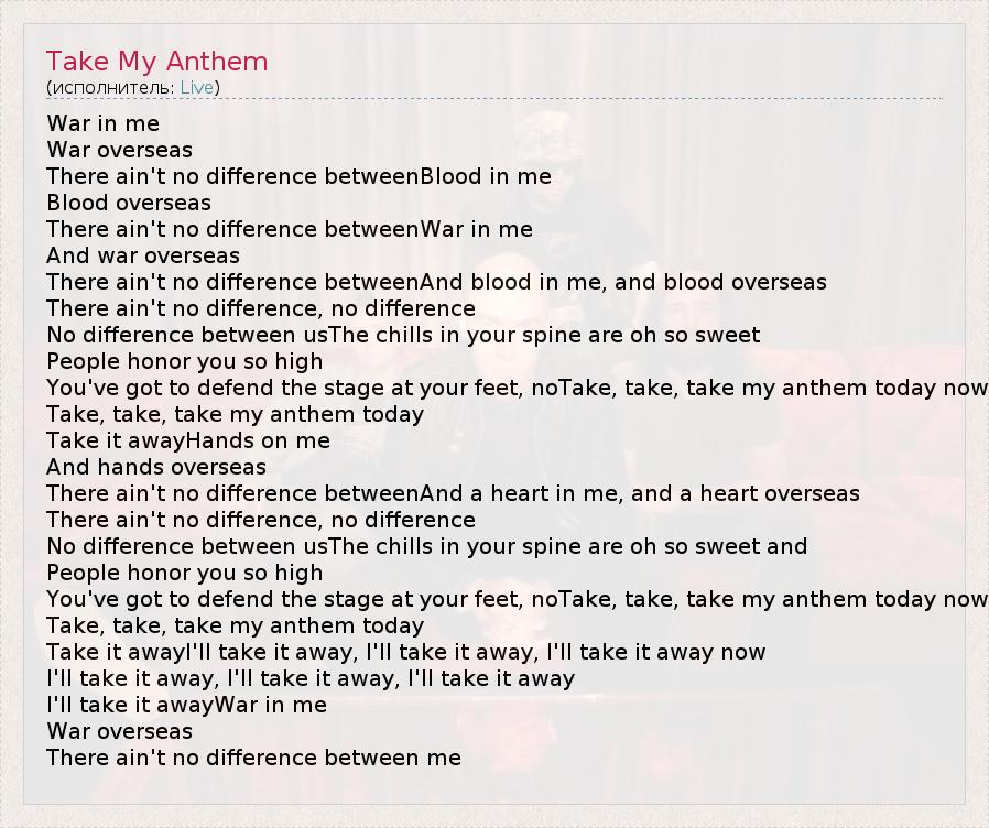 War in me War overseas There ain't no difference betweenBlood in me Blood overseas There ain't no difference betweenWar in me And war overseas There ain't no difference betweenAnd blood in me, and blood overseas There ain't no difference, no difference No difference between usThe chills in your spine are oh so sweet People honor you so high You've got to defend the stage at your feet, noTake, take, take my anthem today now Take, take, take my anthem today Take it awayHands on me And hands overseas There ain't no difference betweenAnd a heart in me, and a heart overseas There ain't no difference, no difference No difference between usThe chills in your spine are oh so sweet and People honor you so high You've got to defend the stage at your feet, noTake, take, take my anthem today now Take, take, take my anthem today Take it awayI'll take it away, I'll take it away, I'll take it away now I'll take it away, I'll take it away, I'll take it away I'll take it awayWar in me War overseas There ain't no difference between me
