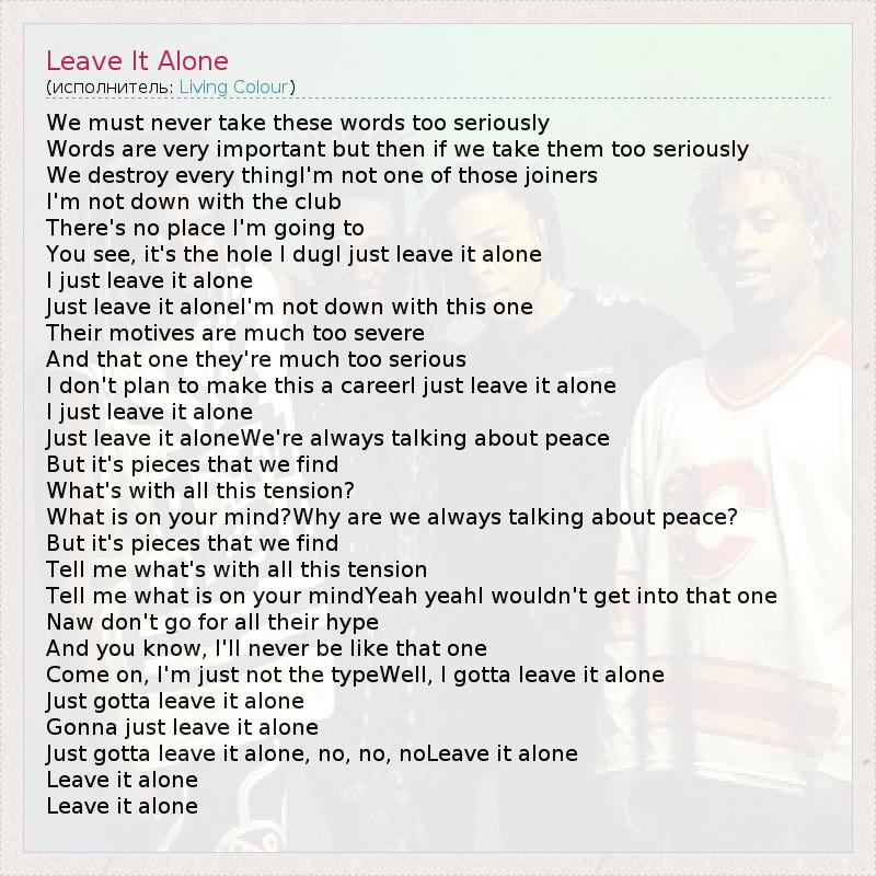 We must never take these words too seriously Words are very important but then if we take them too seriously We destroy every thingI'm not one of those joiners I'm not down with the club There's no place I'm going to You see, it's the hole I dugI just leave it alone I just leave it alone Just leave it aloneI'm not down with this one Their motives are much too severe And that one they're much too serious I don't plan to make this a careerI just leave it alone I just leave it alone Just leave it aloneWe're always talking about peace But it's pieces that we find What's with all this tension? What is on your mind?Why are we always talking about peace? But it's pieces that we find Tell me what's with all this tension Tell me what is on your mindYeah yeahI wouldn't get into that one Naw don't go for all their hype And you know, I'll never be like that one Come on, I'm just not the typeWell, I gotta leave it alone Just gotta leave it alone Gonna just leave it alone Just gotta leave it alone, no, no, noLeave it alone Leave it alone Leave it alone