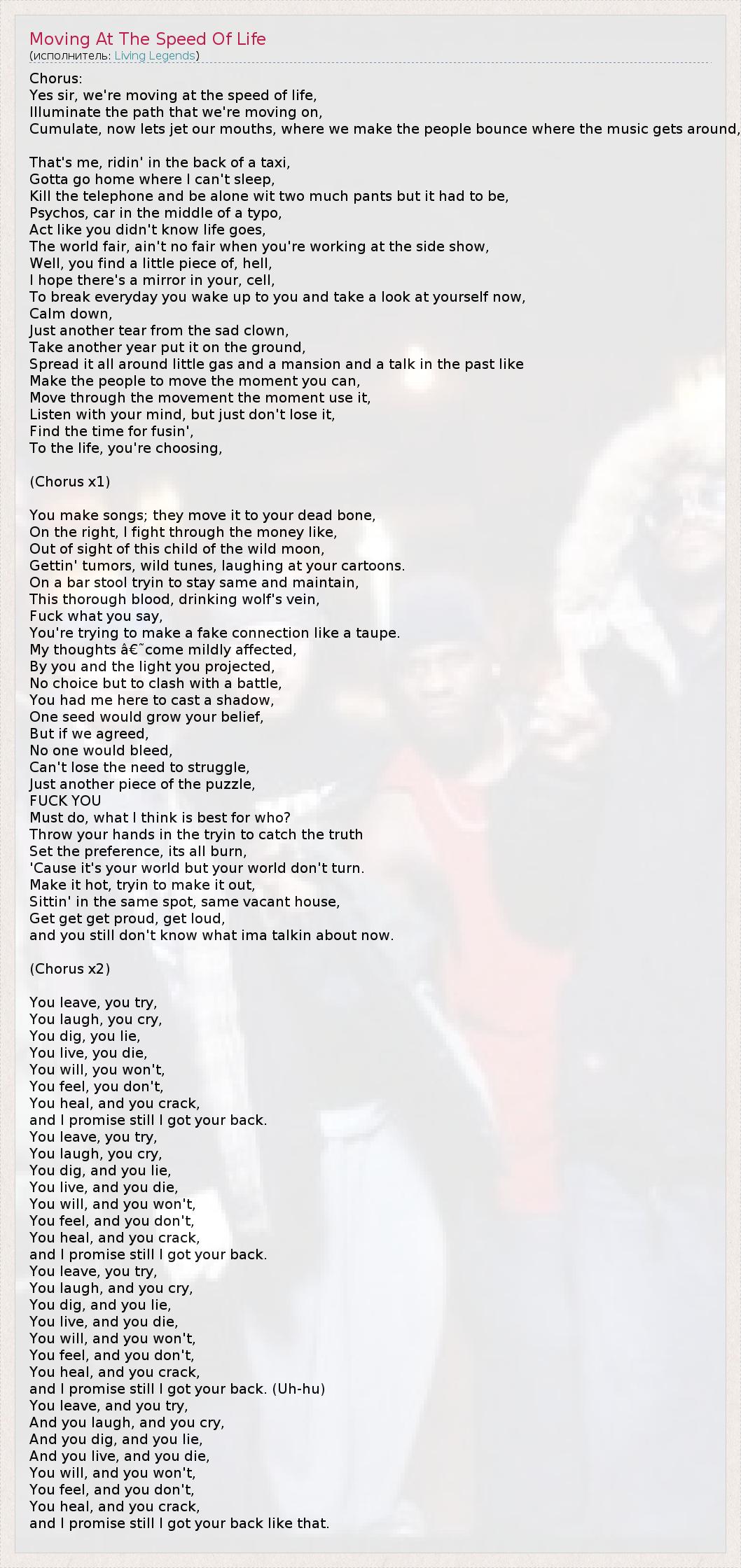 А как ты думаешь, о чем песня "Moving At The Speed Of Life" ?