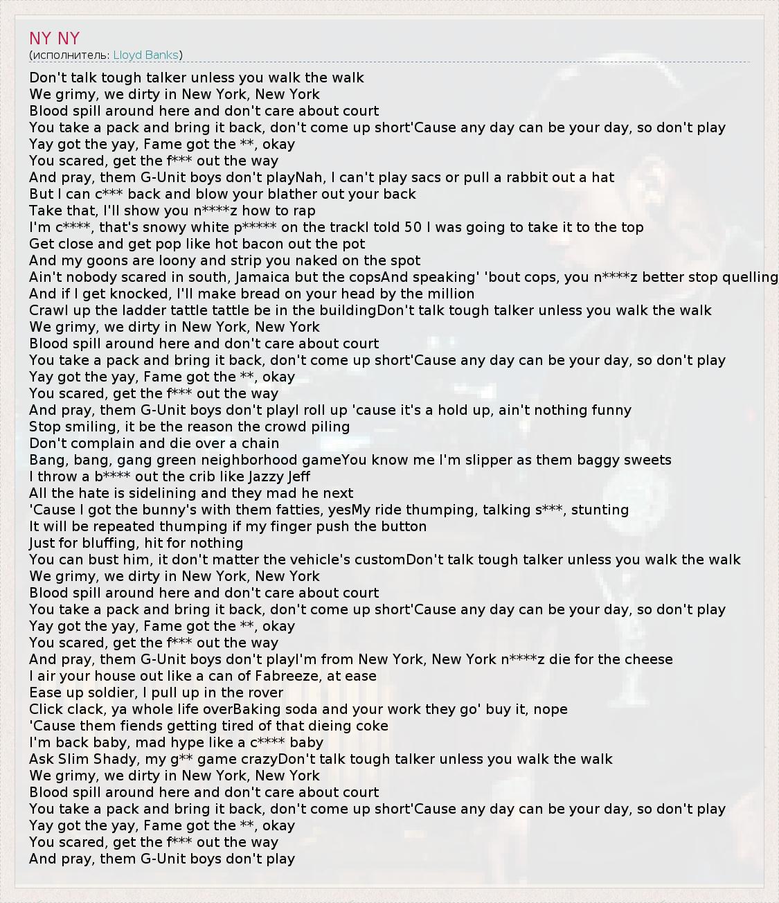 Don't talk tough talker unless you walk the walk We grimy, we dirty in New York, New York Blood spill around here and don't care about court You take a pack and bring it back, don't come up short'Cause any day can be your day, so don't play Yay got the yay, Fame got the **, okay You scared, get the f*** out the way And pray, them G-Unit boys don't playNah, I can't play sacs or pull a rabbit out a hat But I can c*** back and blow your blather out your back Take that, I'll show you n****z how to rap I'm c****, that's snowy white p***** on the trackI told 50 I was going to take it to the top Get close and get pop like hot bacon out the pot And my goons are loony and strip you naked on the spot Ain't nobody scared in south, Jamaica but the copsAnd speaking' 'bout cops, you n****z better stop quelling And if I get knocked, I'll make bread on your head by the million Crawl up the ladder tattle tattle be in the buildingDon't talk tough talker unless you walk the walk We grimy, we dirty in New York, New York Blood spill around here and don't care about court You take a pack and bring it back, don't come up short'Cause any day can be your day, so don't play Yay got the yay, Fame got the **, okay You scared, get the f*** out the way And pray, them G-Unit boys don't playI roll up 'cause it's a hold up, ain't nothing funny Stop smiling, it be the reason the crowd piling Don't complain and die over a chain Bang, bang, gang green neighborhood gameYou know me I'm slipper as them baggy sweets I throw a b**** out the crib like Jazzy Jeff All the hate is sidelining and they mad he next 'Cause I got the bunny's with them fatties, yesMy ride thumping, talking s***, stunting It will be repeated thumping if my finger push the button Just for bluffing, hit for nothing You can bust him, it don't matter the vehicle's customDon't talk tough talker unless you walk the walk We grimy, we dirty in New York, New York Blood spill around here and don't care about court You take a pack and bring it back, don't come up short'Cause any day can be your day, so don't play Yay got the yay, Fame got the **, okay You scared, get the f*** out the way And pray, them G-Unit boys don't playI'm from New York, New York n****z die for the cheese I air your house out like a can of Fabreeze, at ease Ease up soldier, I pull up in the rover Click clack, ya whole life overBaking soda and your work they go' buy it, nope 'Cause them fiends getting tired of that dieing coke I'm back baby, mad hype like a c**** baby Ask Slim Shady, my g** game crazyDon't talk tough talker unless you walk the walk We grimy, we dirty in New York, New York Blood spill around here and don't care about court You take a pack and bring it back, don't come up short'Cause any day can be your day, so don't play Yay got the yay, Fame got the **, okay You scared, get the f*** out the way And pray, them G-Unit boys don't play