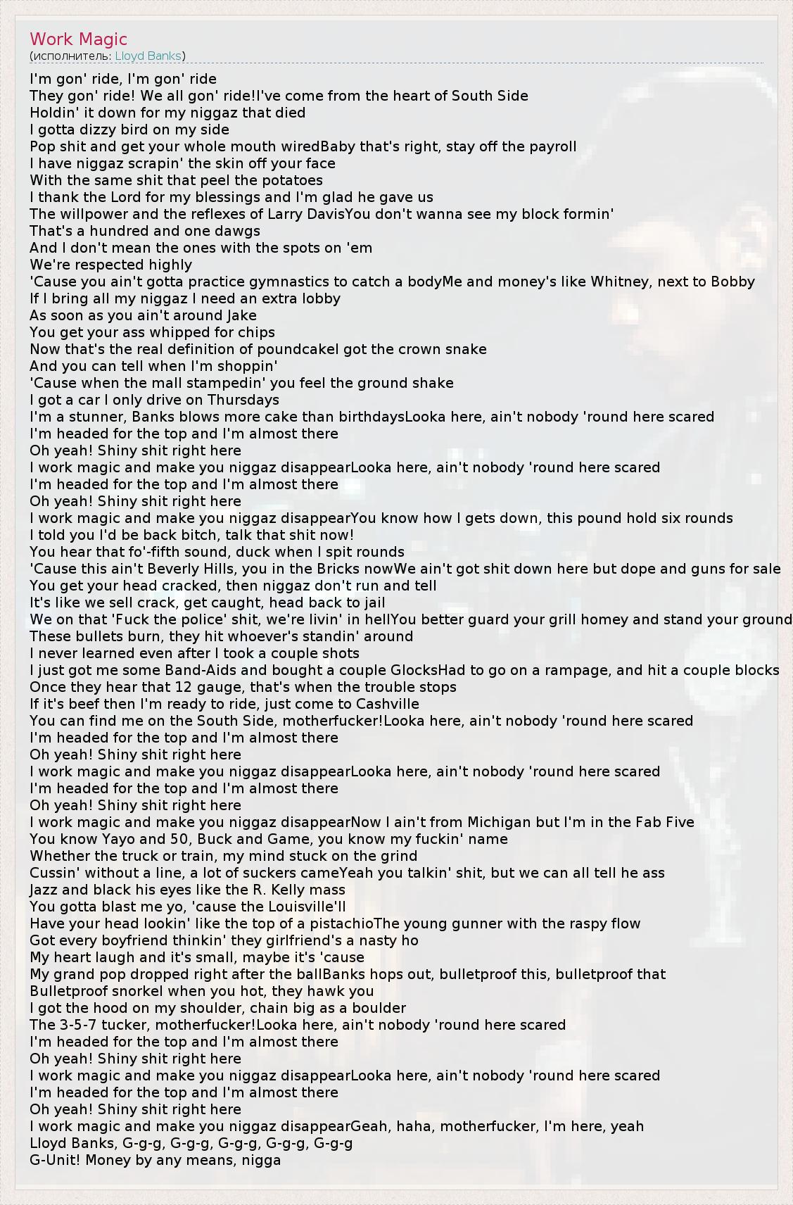 I'm gon' ride, I'm gon' ride They gon' ride! We all gon' ride!I've come from the heart of South Side Holdin' it down for my niggaz that died I gotta dizzy bird on my side Pop shit and get your whole mouth wiredBaby that's right, stay off the payroll I have niggaz scrapin' the skin off your face With the same shit that peel the potatoes I thank the Lord for my blessings and I'm glad he gave us The willpower and the reflexes of Larry DavisYou don't wanna see my block formin' That's a hundred and one dawgs And I don't mean the ones with the spots on 'em We're respected highly 'Cause you ain't gotta practice gymnastics to catch a bodyMe and money's like Whitney, next to Bobby If I bring all my niggaz I need an extra lobby As soon as you ain't around Jake You get your ass whipped for chips Now that's the real definition of poundcakeI got the crown snake And you can tell when I'm shoppin' 'Cause when the mall stampedin' you feel the ground shake I got a car I only drive on Thursdays I'm a stunner, Banks blows more cake than birthdaysLooka here, ain't nobody 'round here scared I'm headed for the top and I'm almost there Oh yeah! Shiny shit right here I work magic and make you niggaz disappearLooka here, ain't nobody 'round here scared I'm headed for the top and I'm almost there Oh yeah! Shiny shit right here I work magic and make you niggaz disappearYou know how I gets down, this pound hold six rounds I told you I'd be back bitch, talk that shit now! You hear that fo'-fifth sound, duck when I spit rounds 'Cause this ain't Beverly Hills, you in the Bricks nowWe ain't got shit down here but dope and guns for sale You get your head cracked, then niggaz don't run and tell It's like we sell crack, get caught, head back to jail We on that 'Fuck the police' shit, we're livin' in hellYou better guard your grill homey and stand your ground These bullets burn, they hit whoever's standin' around I never learned even after I took a couple shots I just got me some Band-Aids and bought a couple GlocksHad to go on a rampage, and hit a couple blocks Once they hear that 12 gauge, that's when the trouble stops If it's beef then I'm ready to ride, just come to Cashville You can find me on the South Side, motherfucker!Looka here, ain't nobody 'round here scared I'm headed for the top and I'm almost there Oh yeah! Shiny shit right here I work magic and make you niggaz disappearLooka here, ain't nobody 'round here scared I'm headed for the top and I'm almost there Oh yeah! Shiny shit right here I work magic and make you niggaz disappearNow I ain't from Michigan but I'm in the Fab Five You know Yayo and 50, Buck and Game, you know my fuckin' name Whether the truck or train, my mind stuck on the grind Cussin' without a line, a lot of suckers cameYeah you talkin' shit, but we can all tell he ass Jazz and black his eyes like the R. Kelly mass You gotta blast me yo, 'cause the Louisville'll Have your head lookin' like the top of a pistachioThe young gunner with the raspy flow Got every boyfriend thinkin' they girlfriend's a nasty ho My heart laugh and it's small, maybe it's 'cause My grand pop dropped right after the ballBanks hops out, bulletproof this, bulletproof that Bulletproof snorkel when you hot, they hawk you I got the hood on my shoulder, chain big as a boulder The 3-5-7 tucker, motherfucker!Looka here, ain't nobody 'round here scared I'm headed for the top and I'm almost there Oh yeah! Shiny shit right here I work magic and make you niggaz disappearLooka here, ain't nobody 'round here scared I'm headed for the top and I'm almost there Oh yeah! Shiny shit right here I work magic and make you niggaz disappearGeah, haha, motherfucker, I'm here, yeah Lloyd Banks, G-g-g, G-g-g, G-g-g, G-g-g, G-g-g G-Unit! Money by any means, nigga