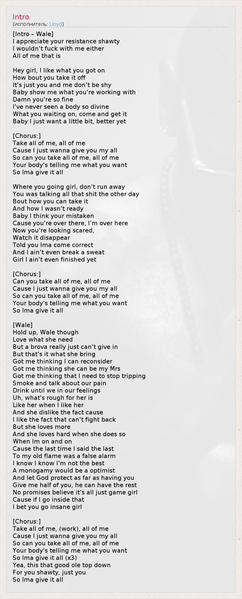 [Intro – Wale] I appreciate your resistance shawty I wouldn't fuck with me either All of me that is Hey girl, I like what you got on How bout you take it off It's just you and me don't be shy Baby show me what you're working with Damn you're so fine I've never seen a body so divine What you waiting on, come and get it Baby I just want a little bit, better yet [Chorus:] Take all of me, all of me Cause I just wanna give you my all So can you take all of me, all of me Your body's telling me what you want So Ima give it all Where you going girl, don't run away You was talking all that shit the other day Bout how you can take it And how I wasn't ready Baby I think your mistaken Cause you're over there, I'm over here Now you're looking scared, Watch it disappear Told you Ima come correct And I ain't even break a sweat Girl I ain't even finished yet [Chorus:] Can you take all of me, all of me Cause I just wanna give you my all So can you take all of me, all of me Your body's telling me what you want So Ima give it all [Wale] Hold up, Wale though Love what she need But a brova really just can't give in But that's it what she bring Got me thinking I can reconsider Got me thinking she can be my Mrs Got me thinking that I need to stop tripping Smoke and talk about our pain Drink until we in our feelings Uh, what's rough for her is Like her when I like her And she dislike the fact cause I like the fact that can't fight back But she loves more And she loves hard when she does so When Im on and on Cause the last time I said the last To my old flame was a false alarm I know I know I'm not the best A monogamy would be a optimist And let God protect as far as having you Give me half of you, he can have the rest No promises believe it's all just game girl Cause if I go inside that I bet you go insane girl [Chorus:] Take all of me, (work), all of me Cause I just wanna give you my all So can you take all of me, all of me Your body's telling me what you want So Ima give it all (x3) Yea, this that good ole top down For you shawty, just you So Ima give it all